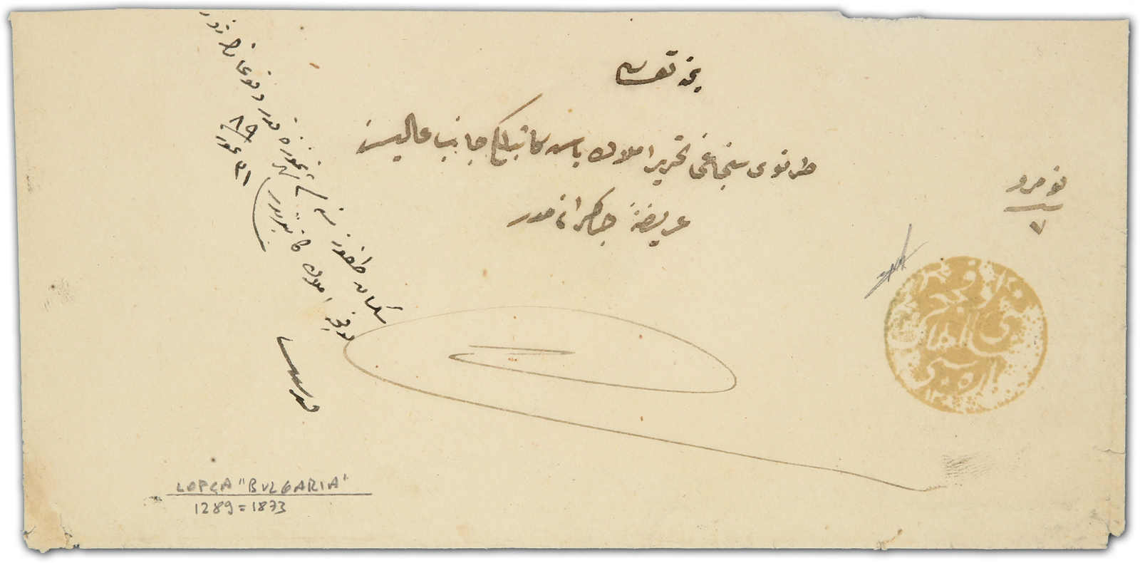 Lovech - Lofça: 1873, official cover from Lovech to Tirnovo dated "21 Temmuz 1289" (= 2 August 1873) by manuscript at left front side showing all Arabic large negative "Lofça Kazası Emlak Idaresi" brownish seal, unrecorded by any
