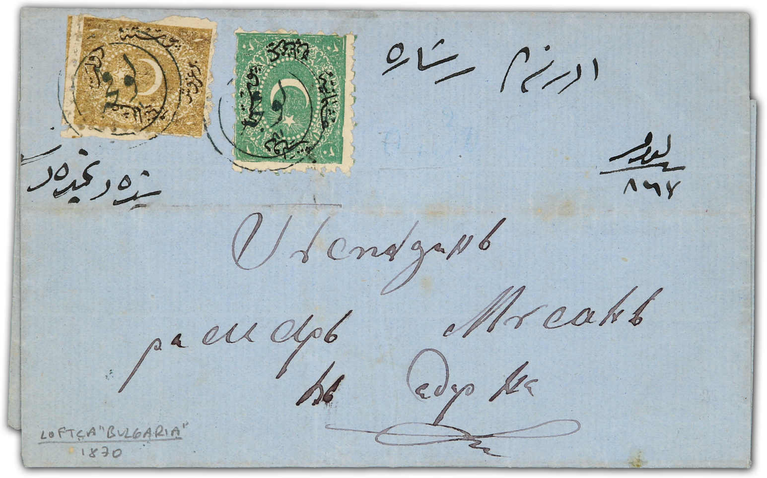 Lovech - Lofça: 1870, entire letter from Lofça to Edirne bearing 1868/71 irregular perforation issue 20 para green and 1 piastre yellow Duloz stamps tied by all Arabic very clear and rare double-circle "Lofça 81" handstamps (Coles &