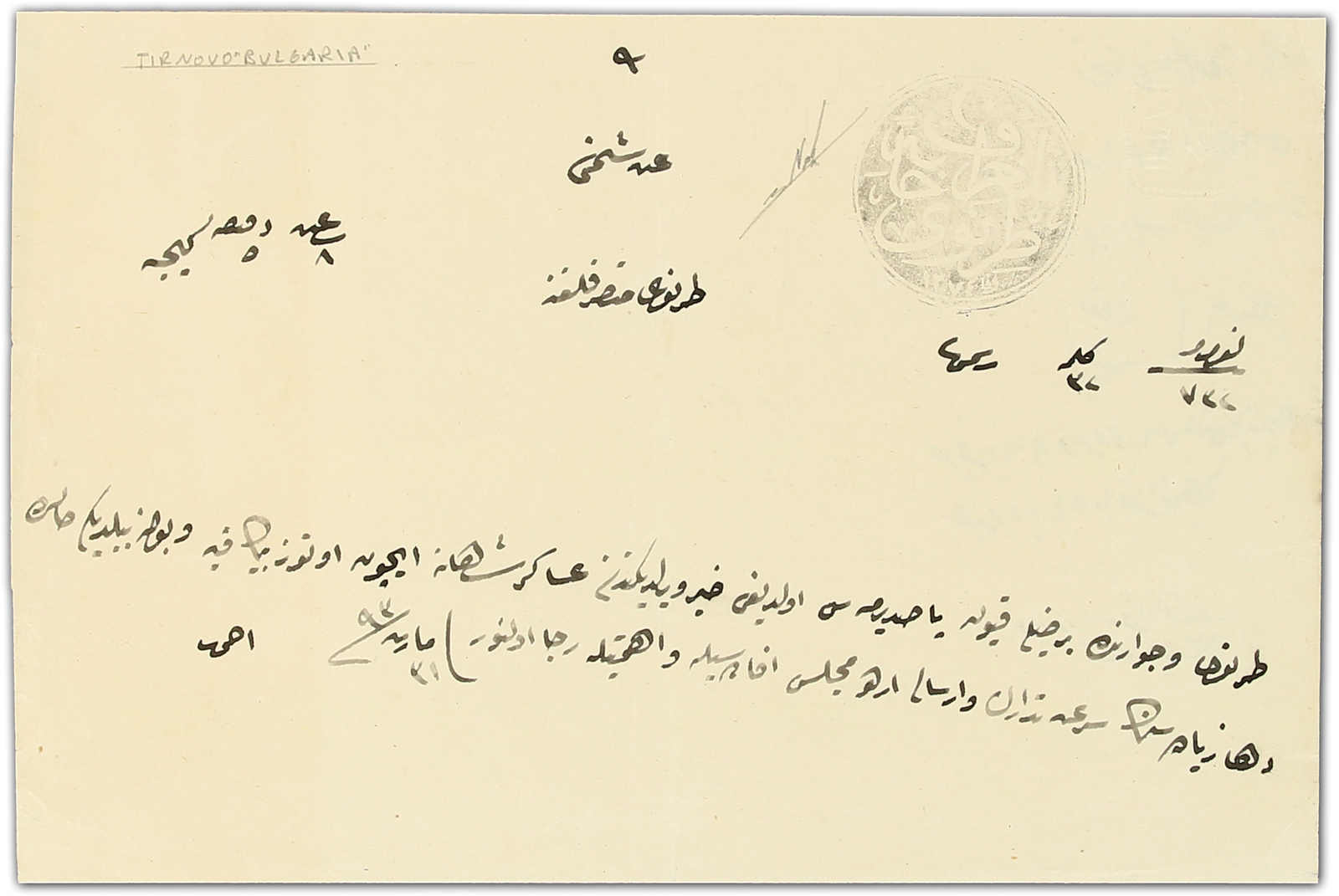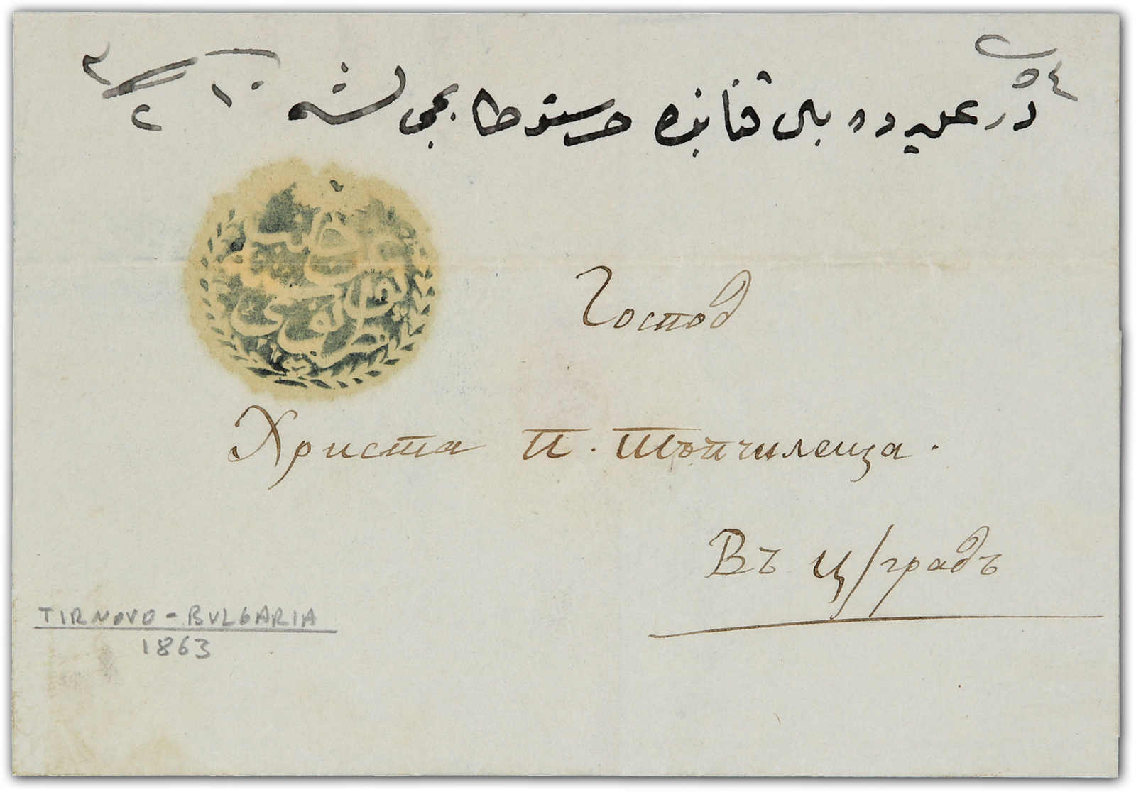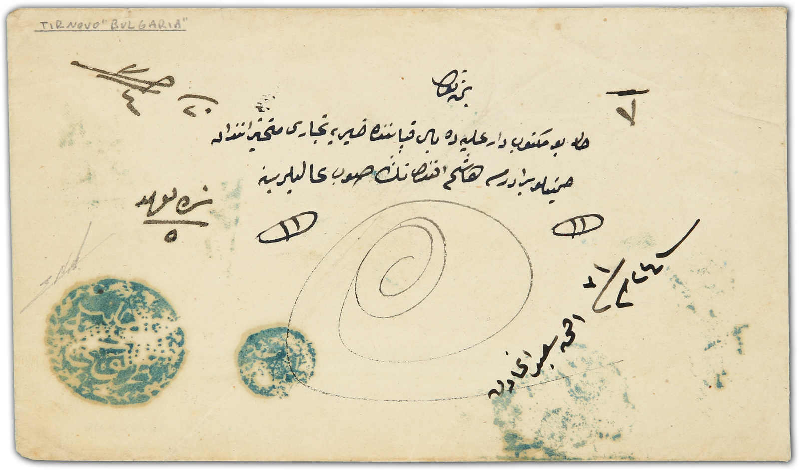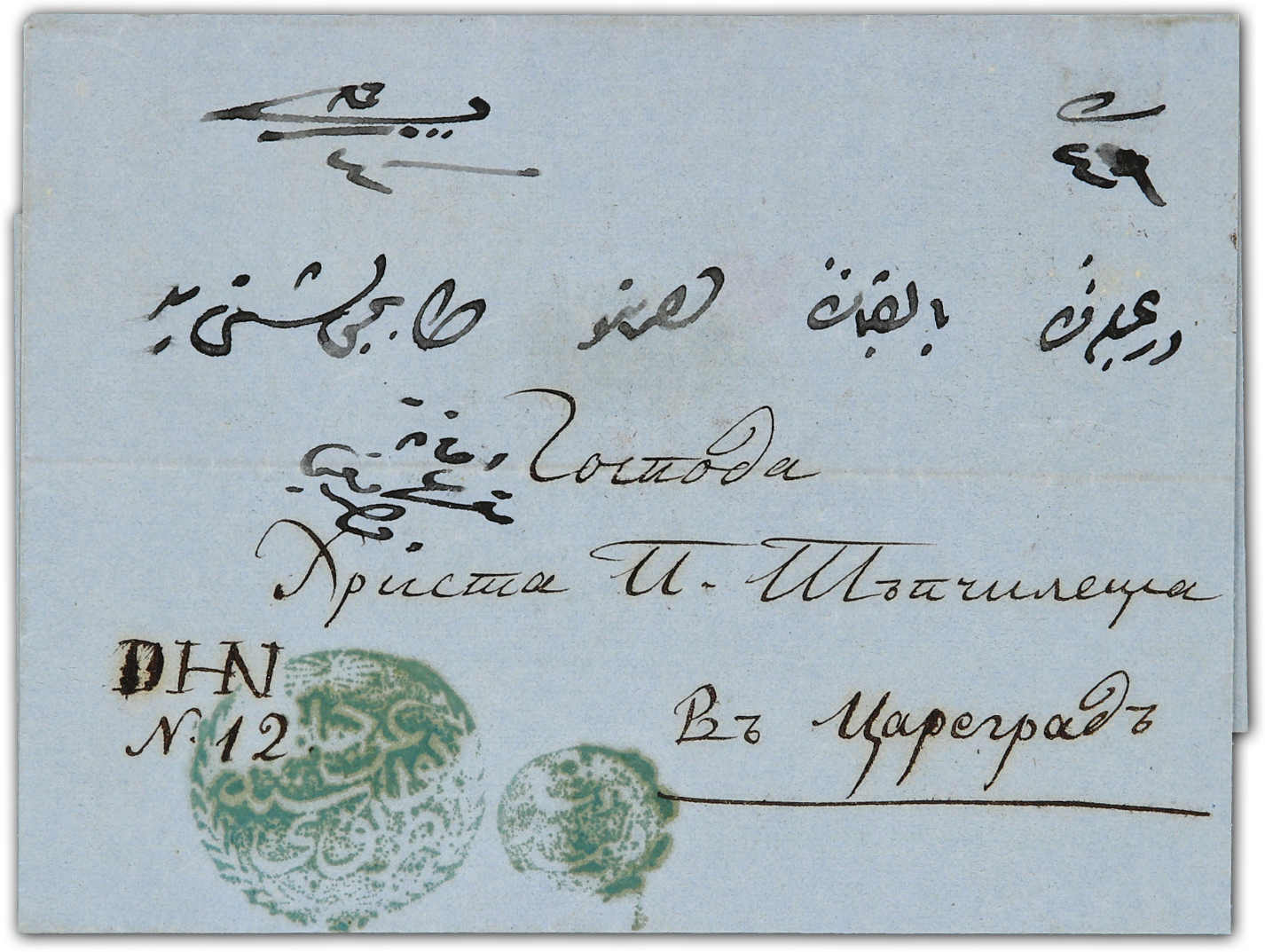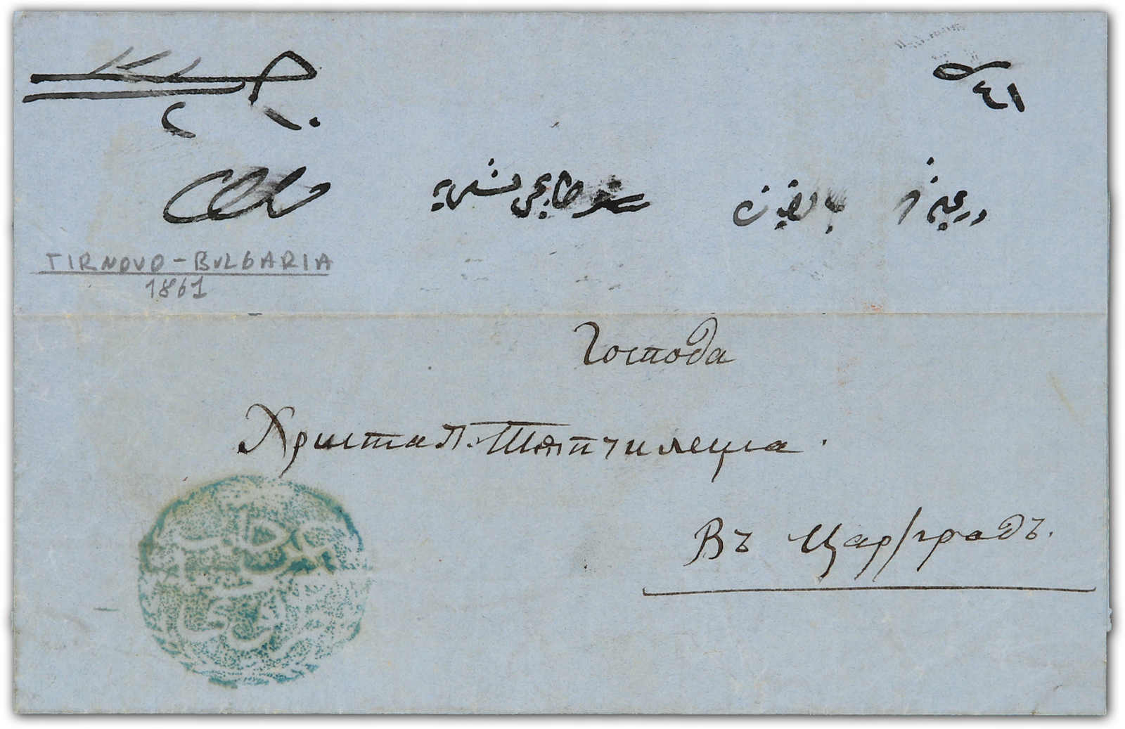 Veliko Tarnovo-Tırnova: 1861, prephilatelic entire letter from Veliko Tarnovo to Constantinople showing very fine struck of all Arabic negative "An Canib-i Posta-i Tırnova 1262" (="On behalf of Veliko Tarnovo post office 1846") greenish