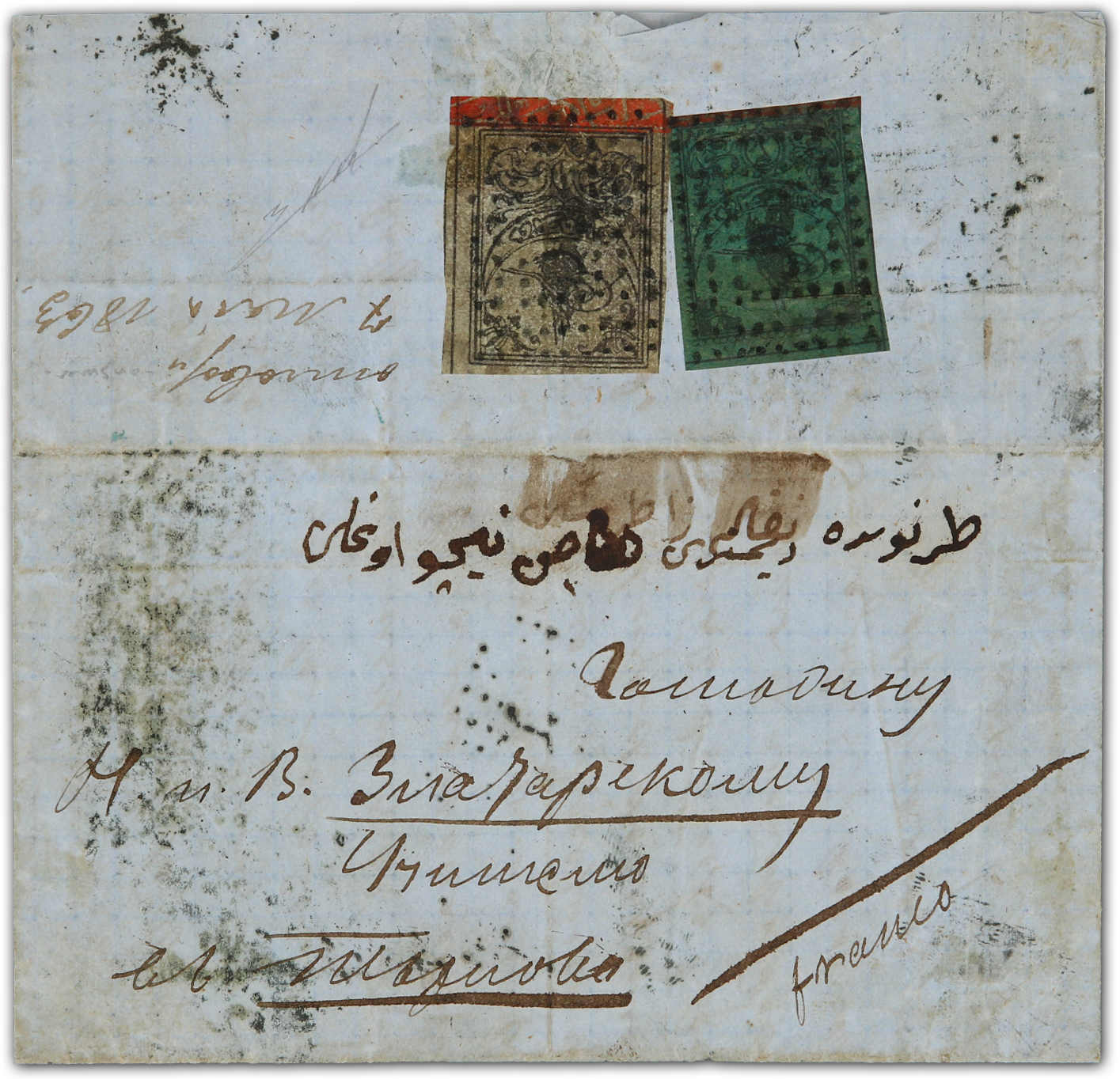 Svishtov-Ziştovi: 1863, cover from Svishtov to Constantinople with green oval sender's cachet at top, showing all Arabic negative "Ücreti Alinacaktir" (="Fee will be collected") postage due handstamp in blue (Coles & Walker fig. 15),
