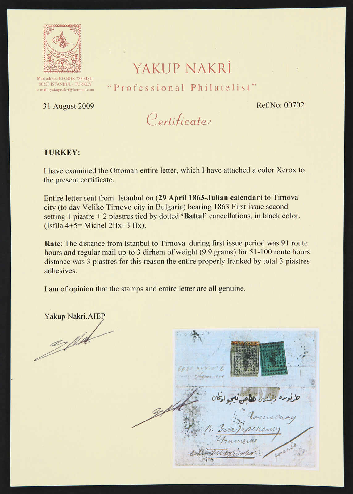 Veliko Tarnovo-Tırnova: 1863, entire letter dated 29 April 1863 sent from Constantinople to Veliko Tarnovo bearing Ottoman first issue second setting 1 piastre and 2 piastres tied by dotted "Battal" handstamps in black, cert. Nakri Note: