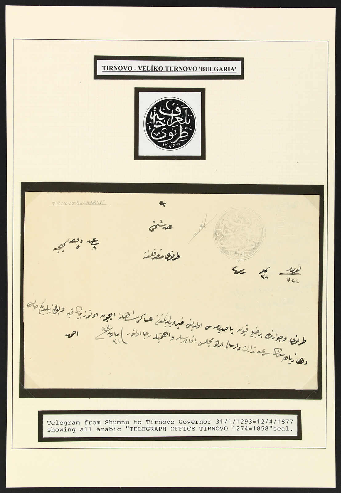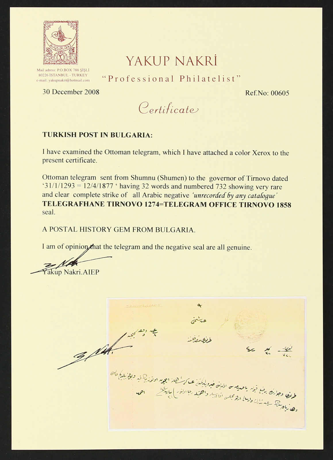 Veliko Tarnovo-Tırnova: 1877, telegram sent from Shumnu to Veliko Tarnovo dated 31 Mart 1293 = 12 April 1877 showing extremely rare and clear strike of large size Arabic negative "Telgrafhane-i Tırnovo 1274" (Telegram Office Tarnovo 1858)