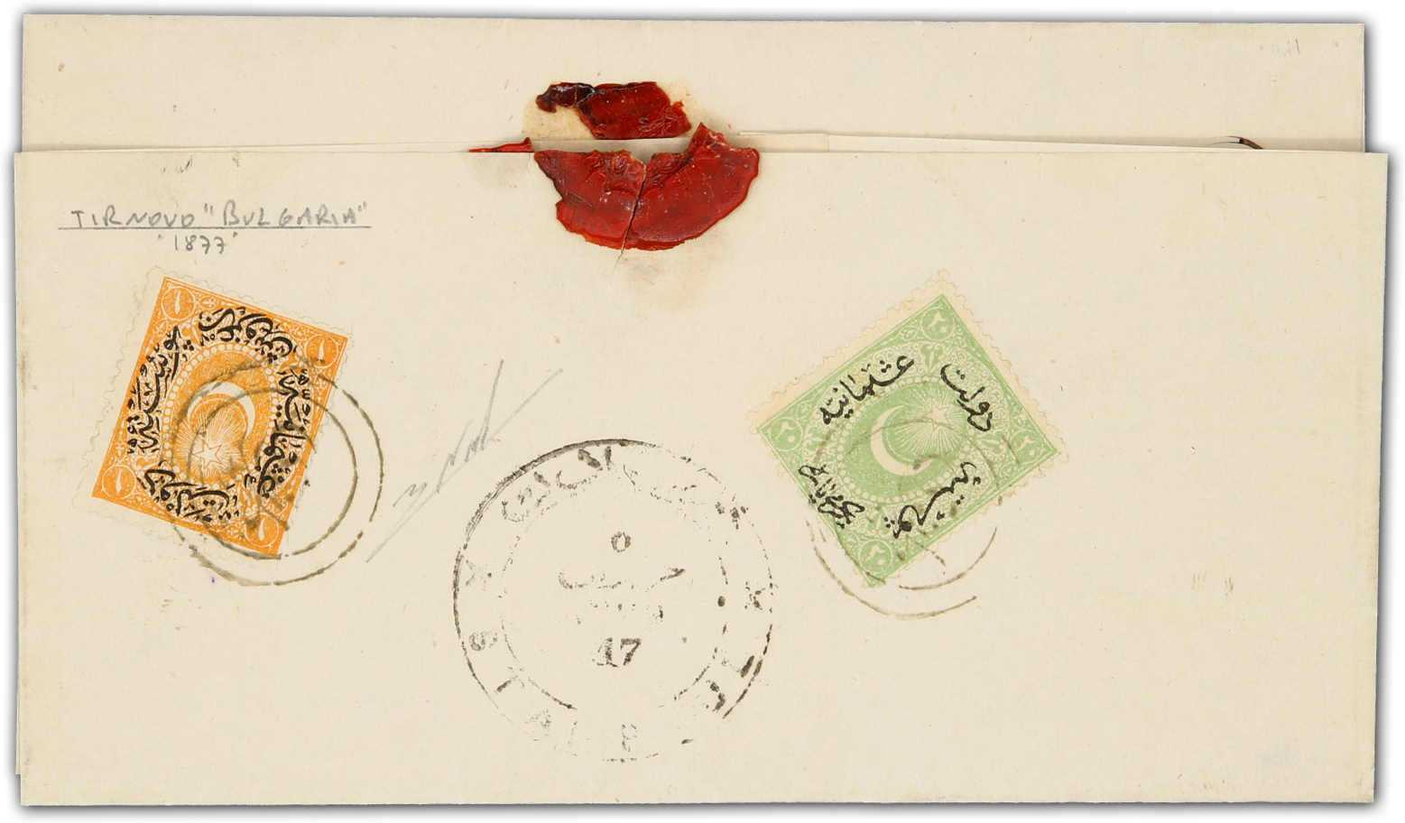Veliko Tarnovo-Tırnova: 1877, folded letter from Veliko Tarnovo to Constantinople bearing on reverse Duloz 1876 1 piastre orange- yellow and 1875 20 para green tied by fine strikes of Arabic double-circle "Tirnovo 81" handstamp in black