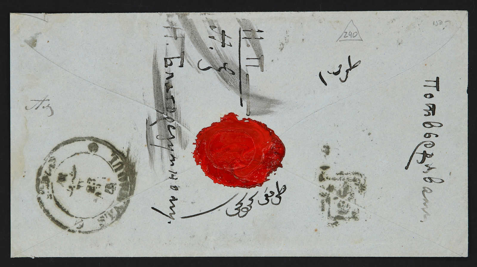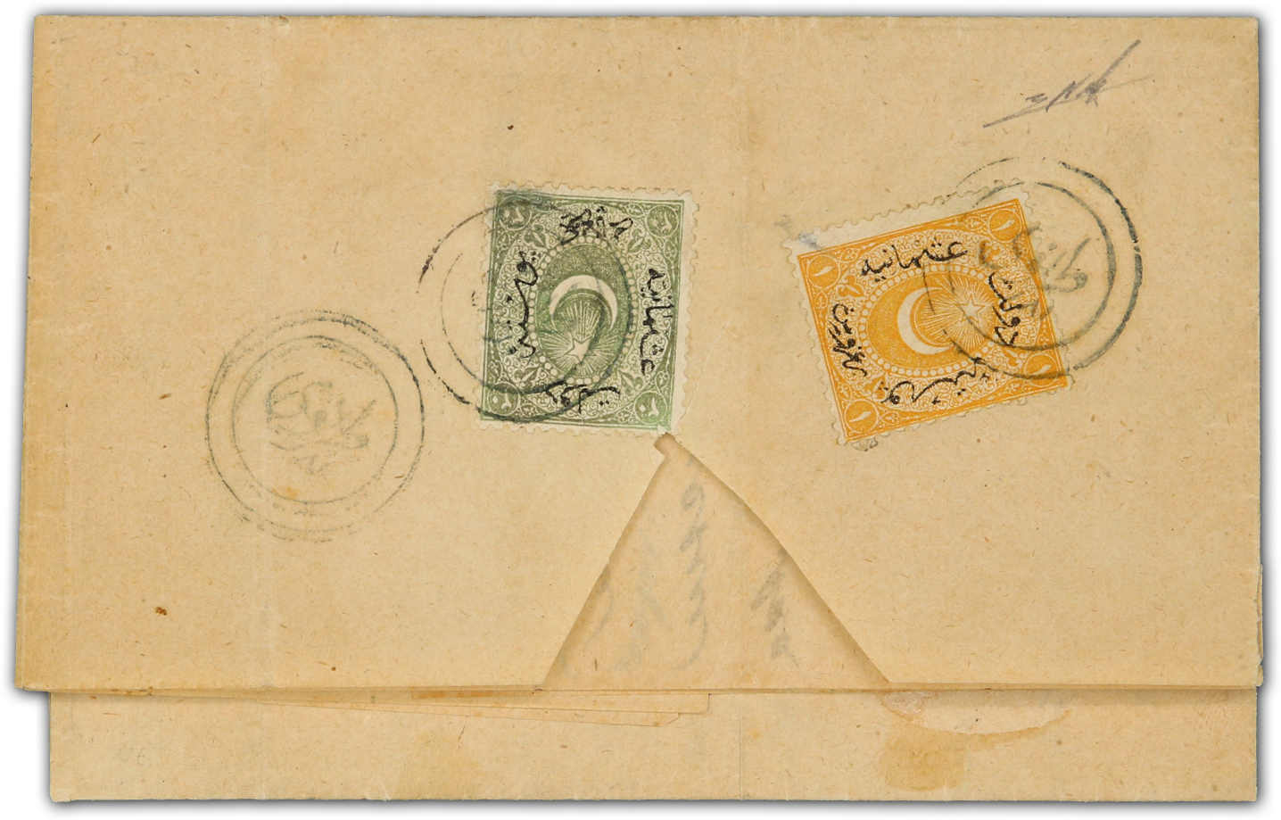 handstamp (Coles & Walker fig. 77), at top left showing by manuscript weight 3 Dirhem / postal charge 2 piastres 10 paras (Image)