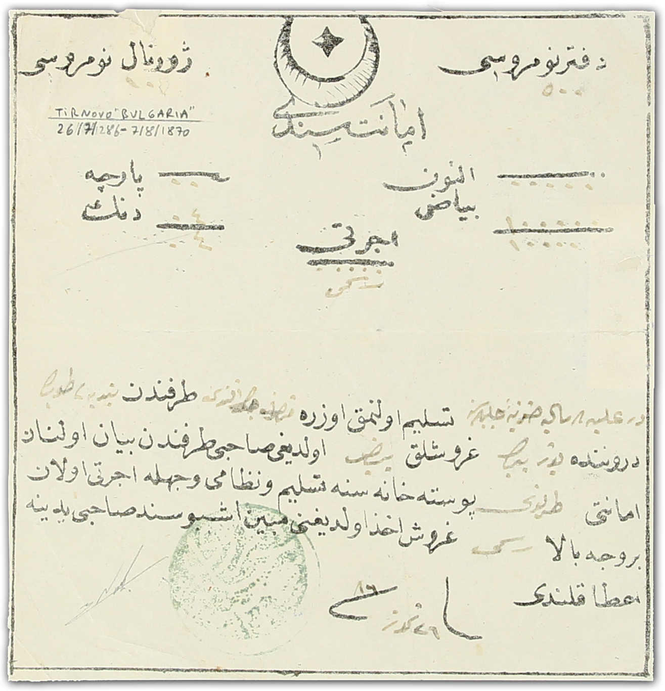 Veliko Tarnovo-Tırnova: 1870, postal money order form dated 26 Temmuz 1286 = 7 August 1870 for 100'000 silver coins sent from Veliko Tarnovo to Constantinople with good strike of Arabic negative with crescent "Postahane-i Tirnova 1278"