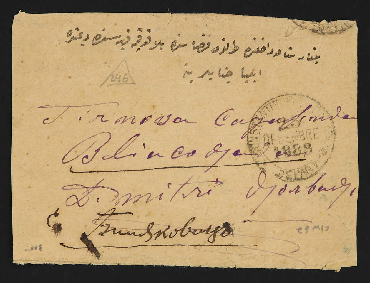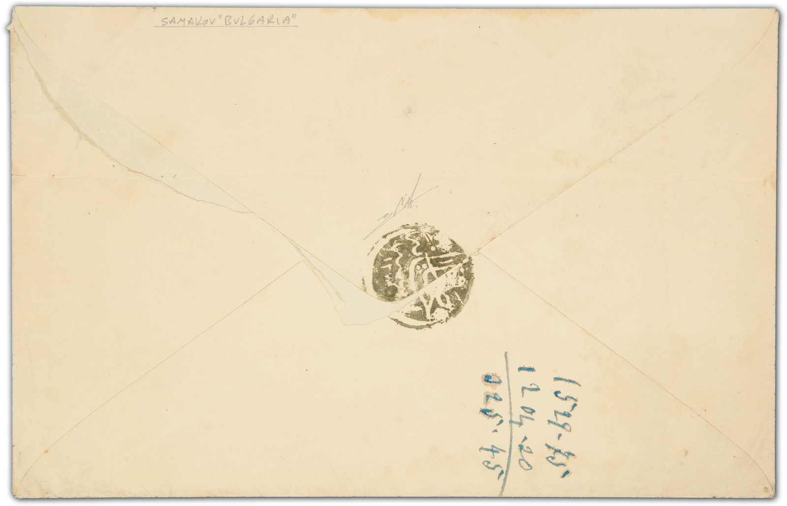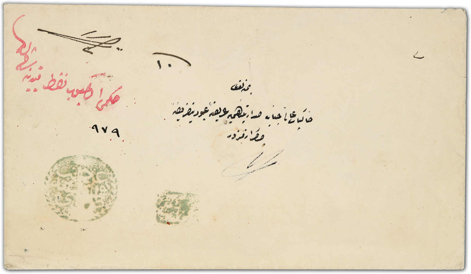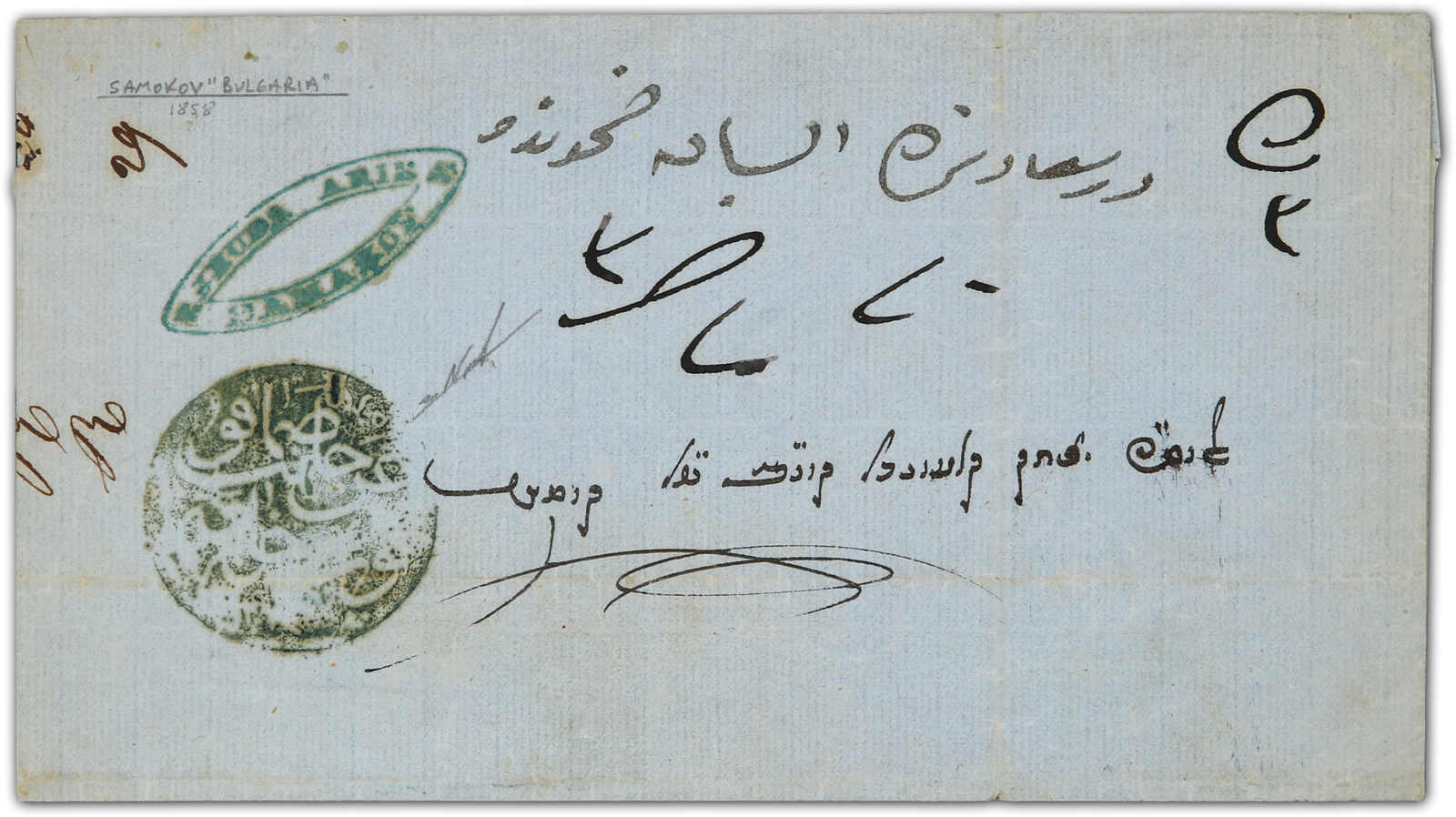 Samokov-Samakov: 1861, telegram envelope showing on reverse extremely rare Arabic negative with Crescent type "Postahane-i Samakov 1278" (Post Office Samakov 1861) handstamp in black (İsfila AP02), signed Nakri (Image) (imagea)