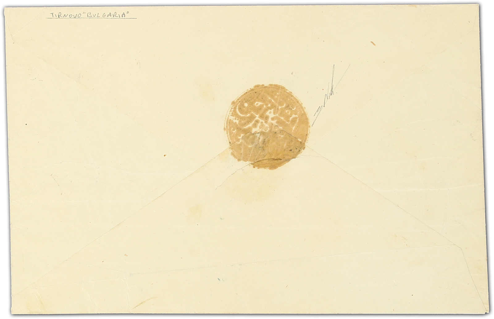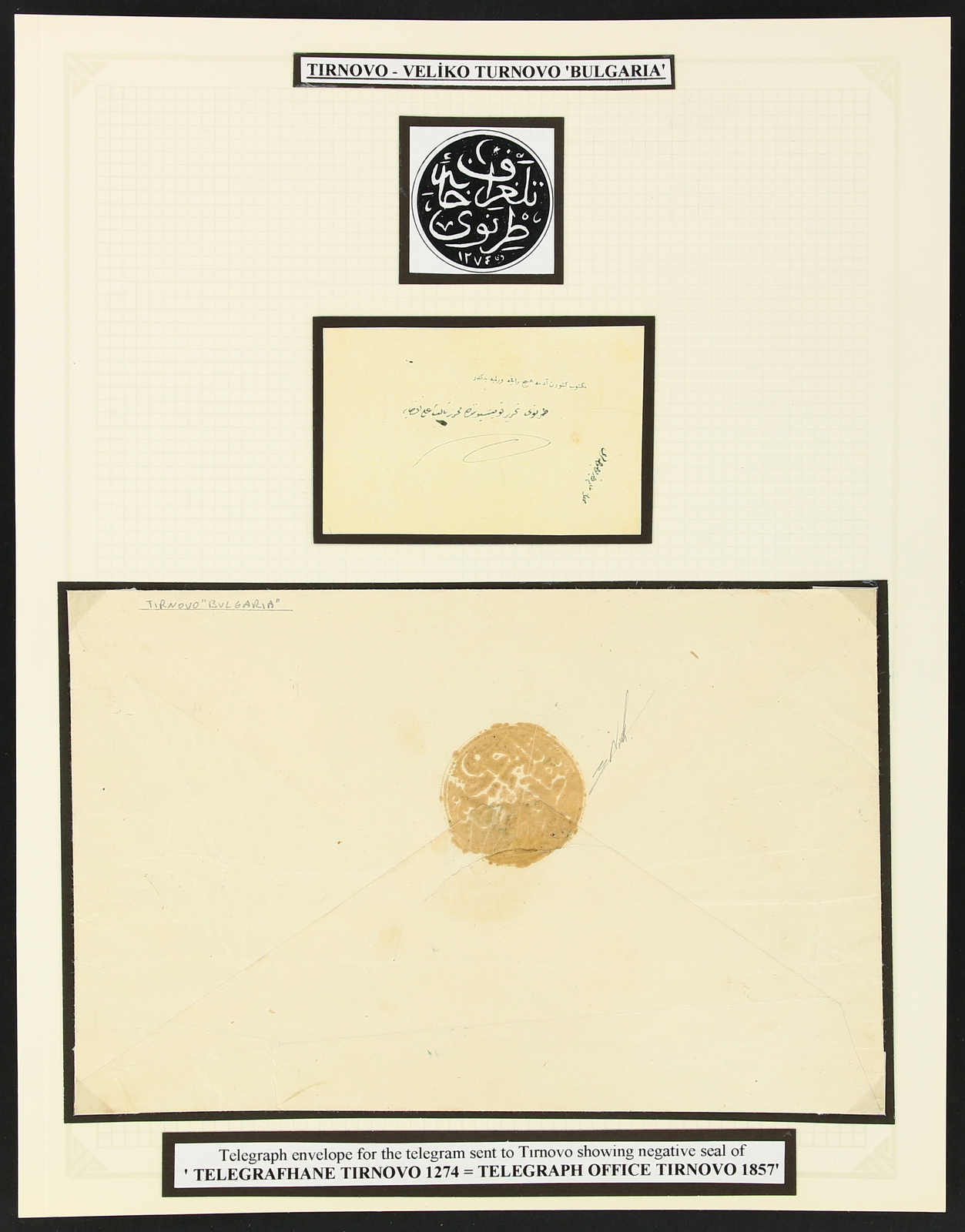 Veliko Tarnovo-Tirnova: 1857/77 approx.,telegram envelope showing on reverse rare all Arabic negative "Telgrafhane-i Tirnovo 1274" handstamp struck in brown, somewhat over-inked (Isfila AP06), rare, signed Nakri (Image) (imagea)