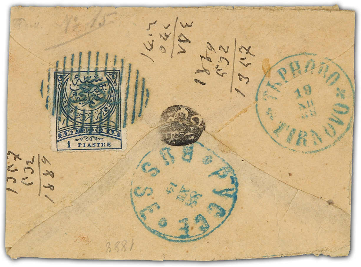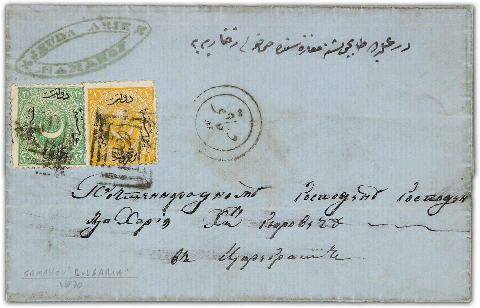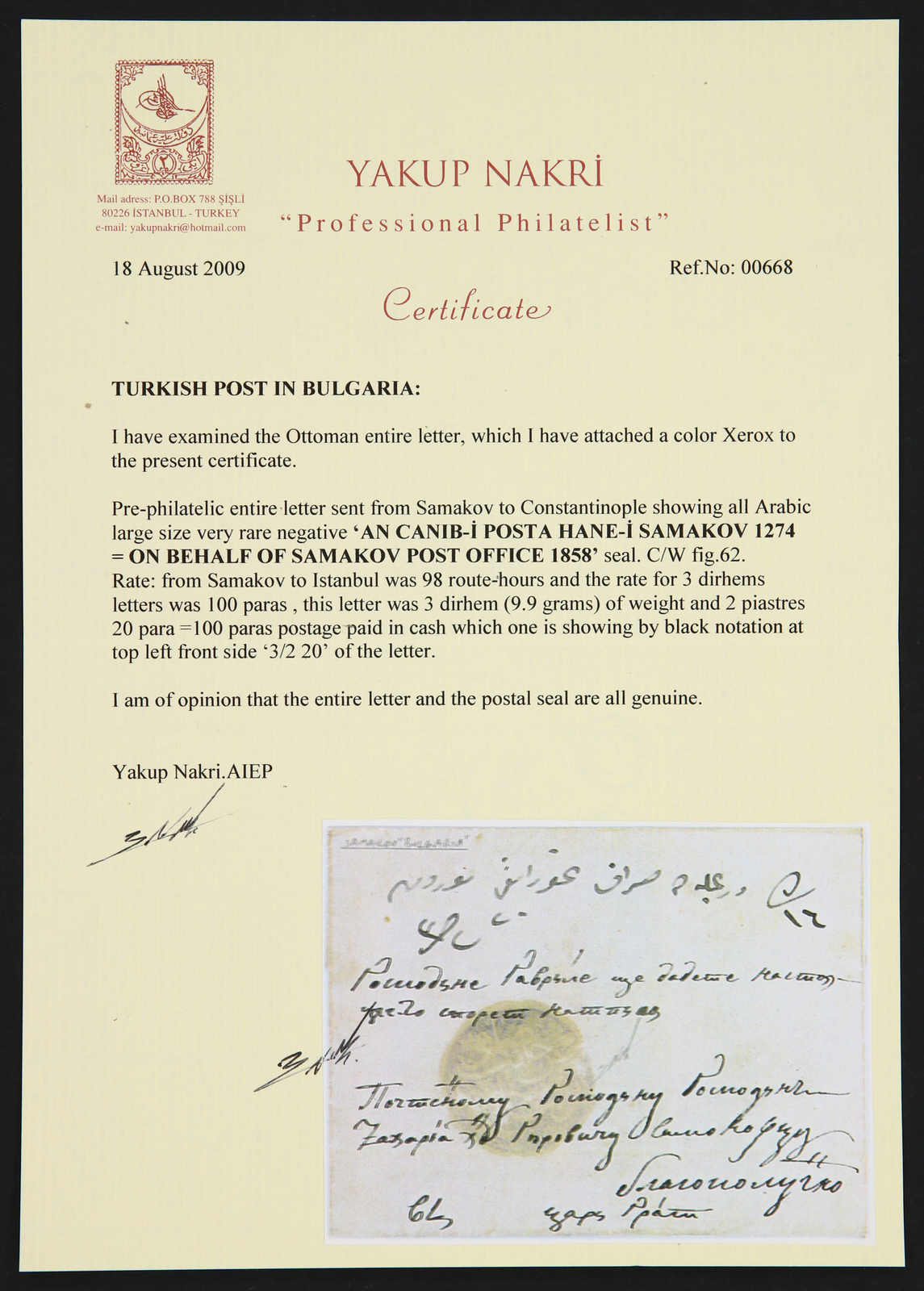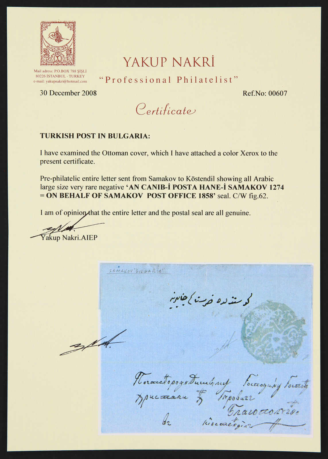 just two recorded covers with this extremely rare postmark, a magnificent and noteworthy cover, one of the most beautiful and rare covers of Bulgarian & Ottoman philately, a fabulous showpiece! cert. Nakri (Image) (imagea)