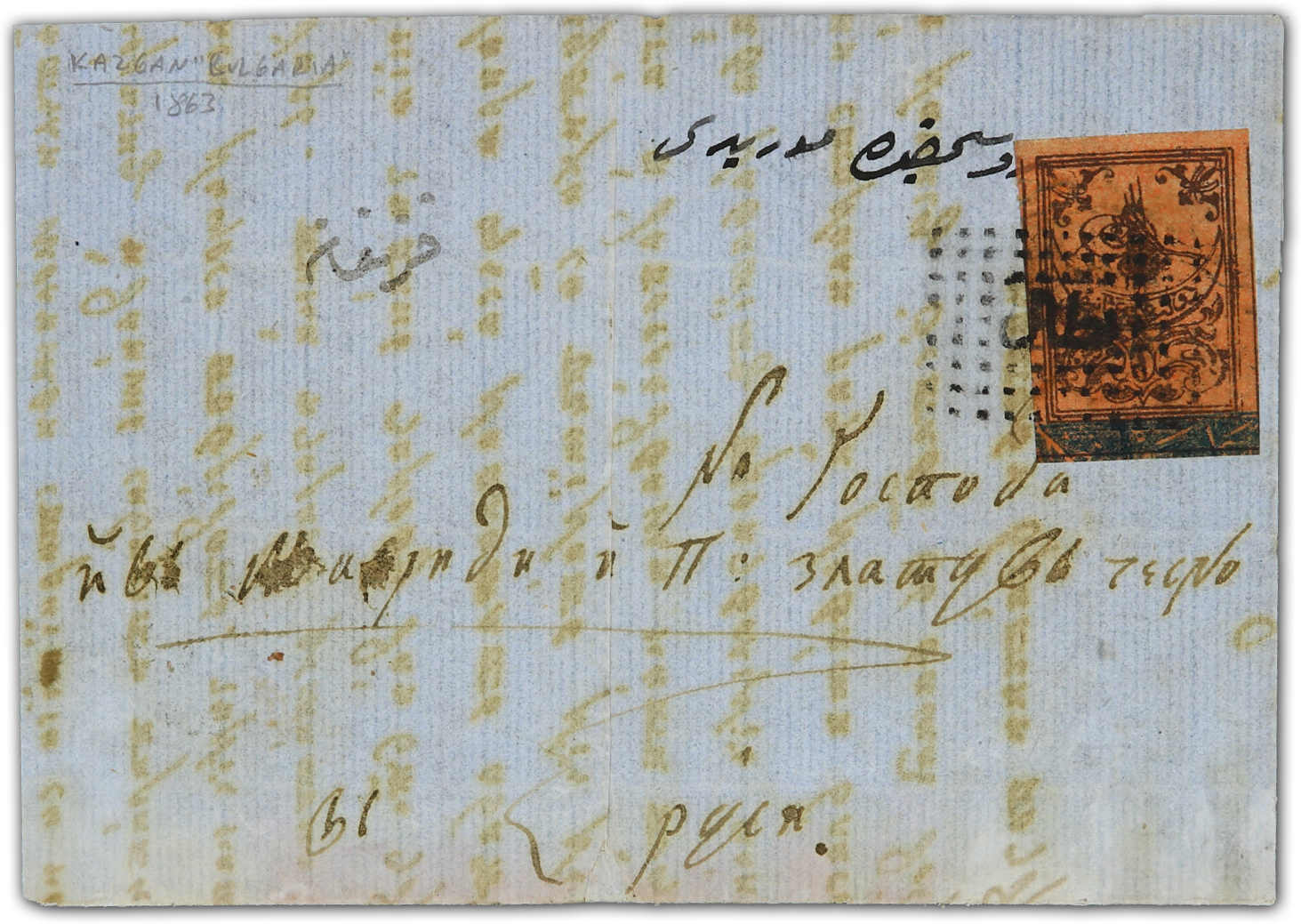 Kotel-Kazgan: 1863, entire letter from Kotel to Ruse bearing single franking first issue Tughra postage due 1 piastre black print, red-brown coloured on face stamp tied by very clear dotted "Battal" handstamp, at left top side showing by