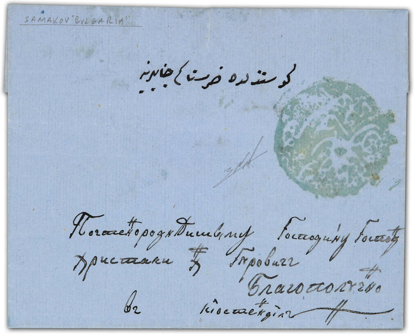 Samokov-Samakov: 1858 approx., cover from Samokov to Köstendil with fine strike of all Arabic circular negative "An Canib-i Postahane-i Samakov 1274" handstamp in blue-green (Coles & Walker fig. 62), a fine and scarce cover! (Image) (imagea)
