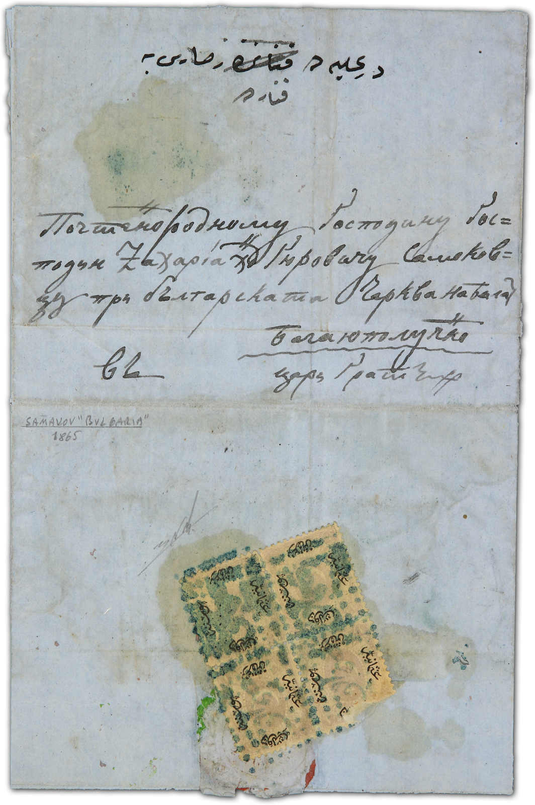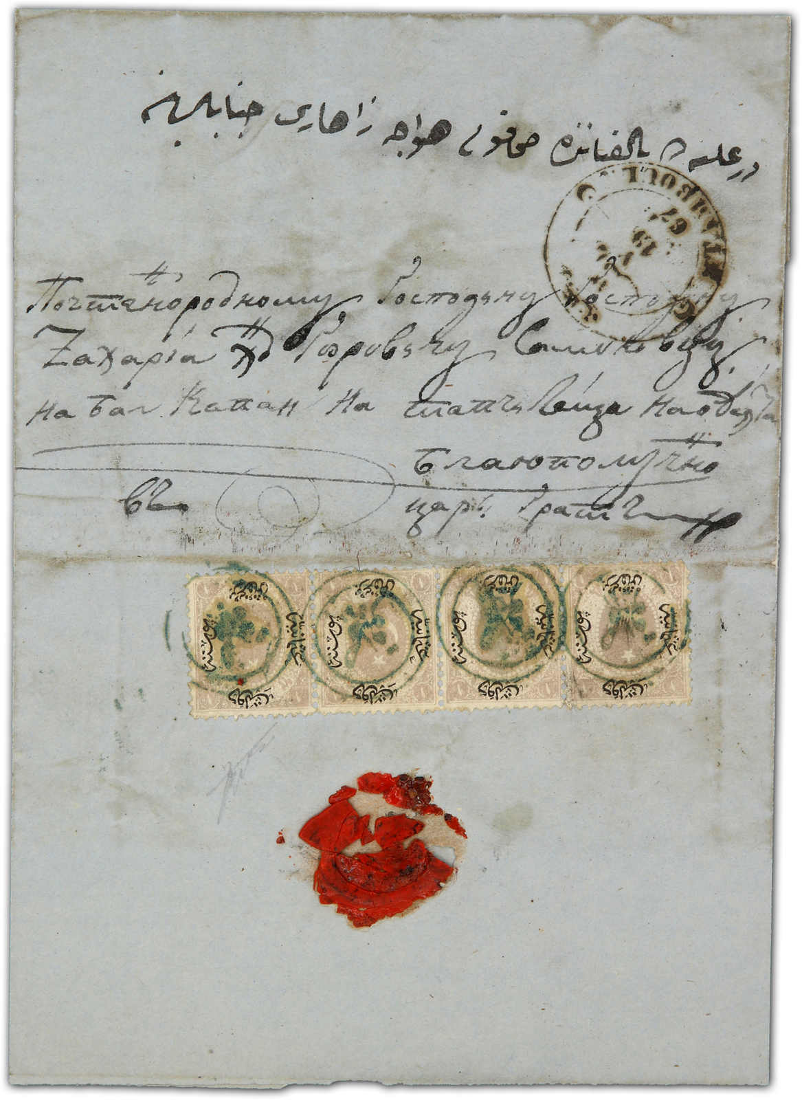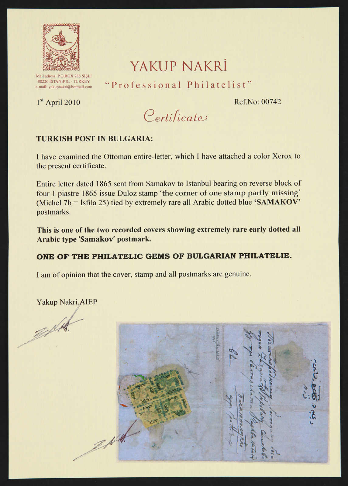 Samokov - Samakov: entire dated 1865 from Samakov to Constantinople bearing on reverse block of four Duloz 1865 1 piastre lilac (small tear at base) tied by extremely rare dotted Arabic "Samakov" handstamp in blue (İsfila AP03), one of