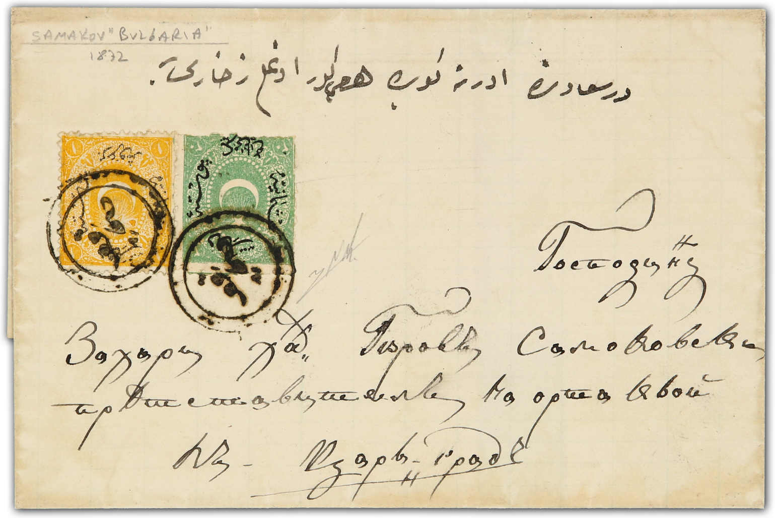 Samokov - Samakov: 1872, entire from Samokov to Constantinople bearing Duloz 1868 1 piastre yellow and 1869/71 20 para green tied by superb Arabic double-circle "Samakov 81" handstamps in black (Coles & Walker fig. 63), reverse with faint