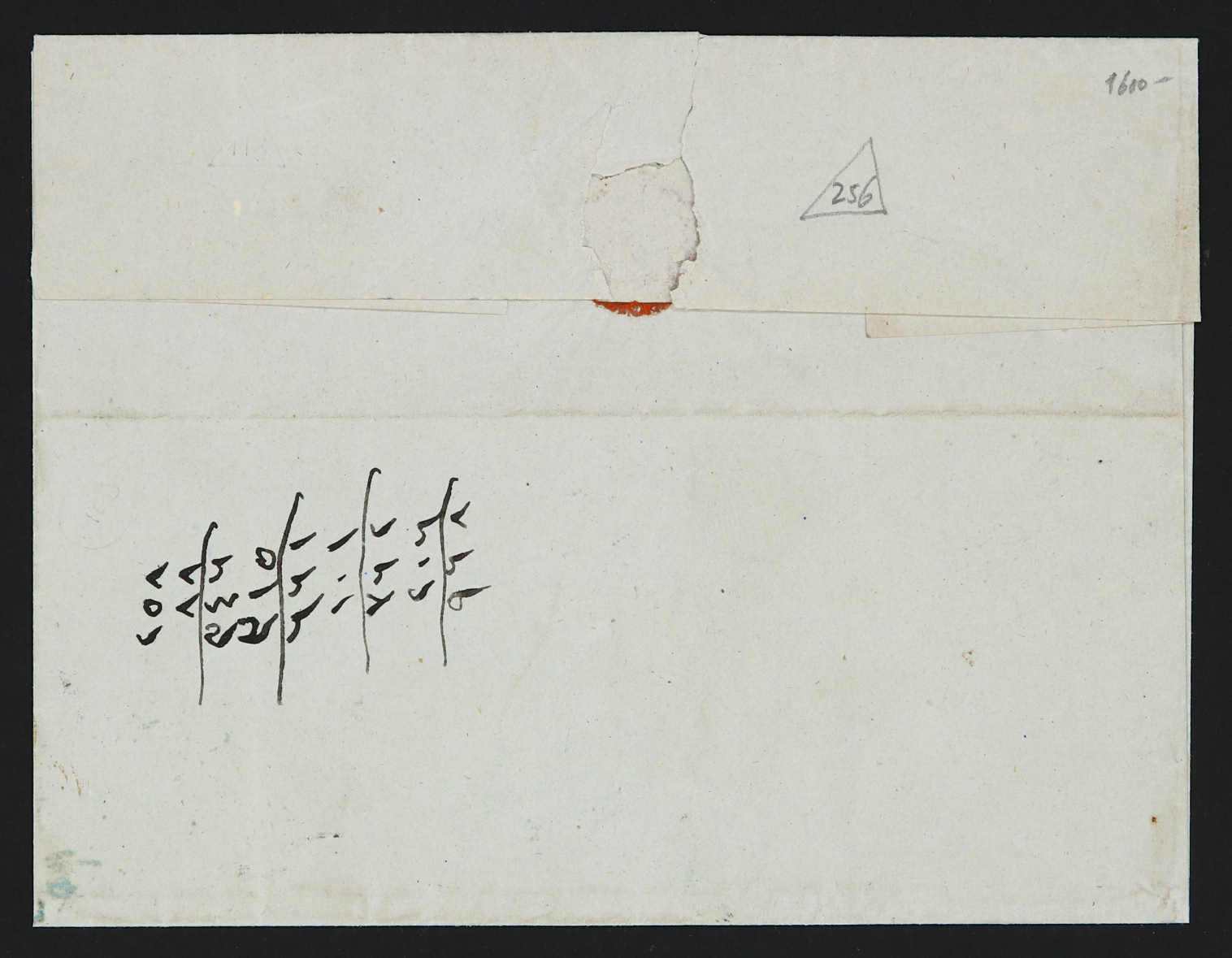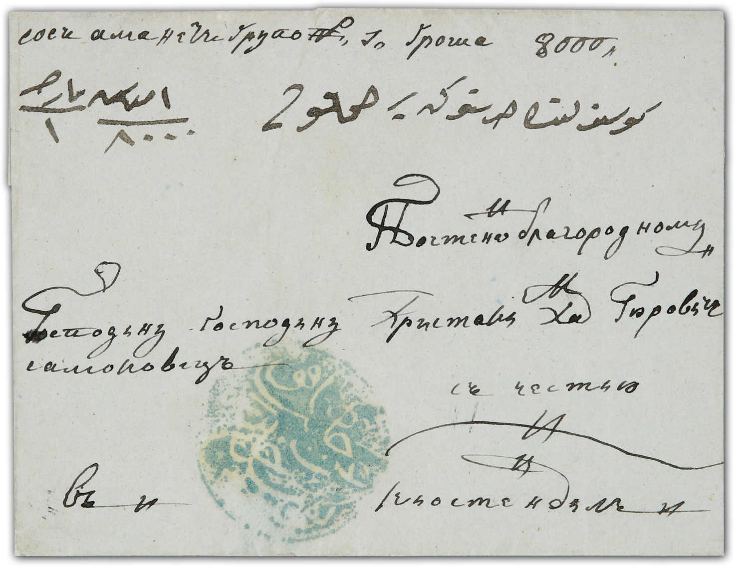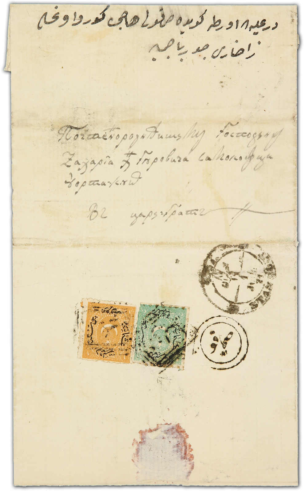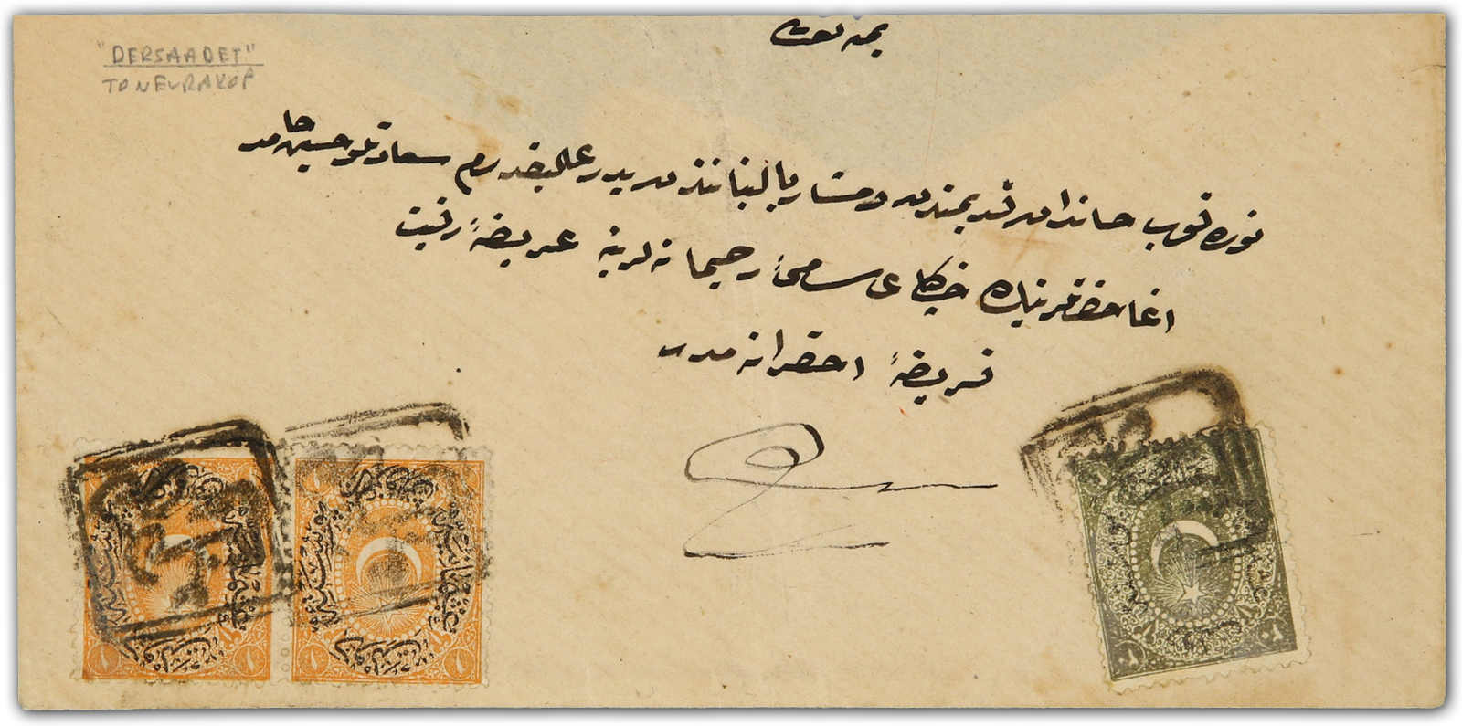 upper left, alongside weight 3 Dirhem / postal charge 2 piastres 20 paras in manuscript, signed Nakri (Image)