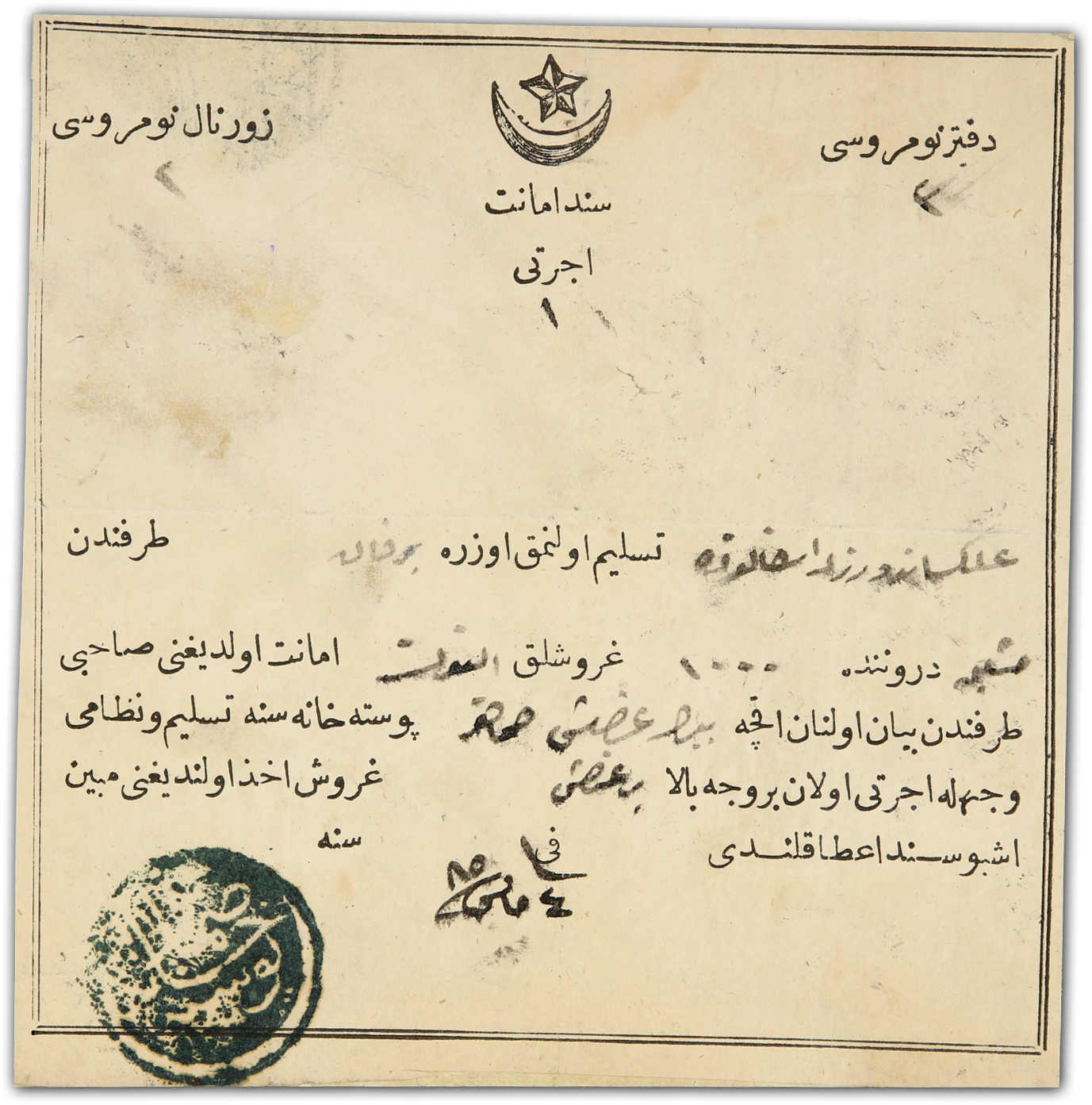 Samokov-Samakov: 1869, postal money order form dated "4 Mayis 1285" (= 16 May 1869) made out for 1'000 piasters in gold sent from Samakov to Shumen showing rare and fine all Arabic negative (Crescent type) "Postahane-i Samakov 1278"
