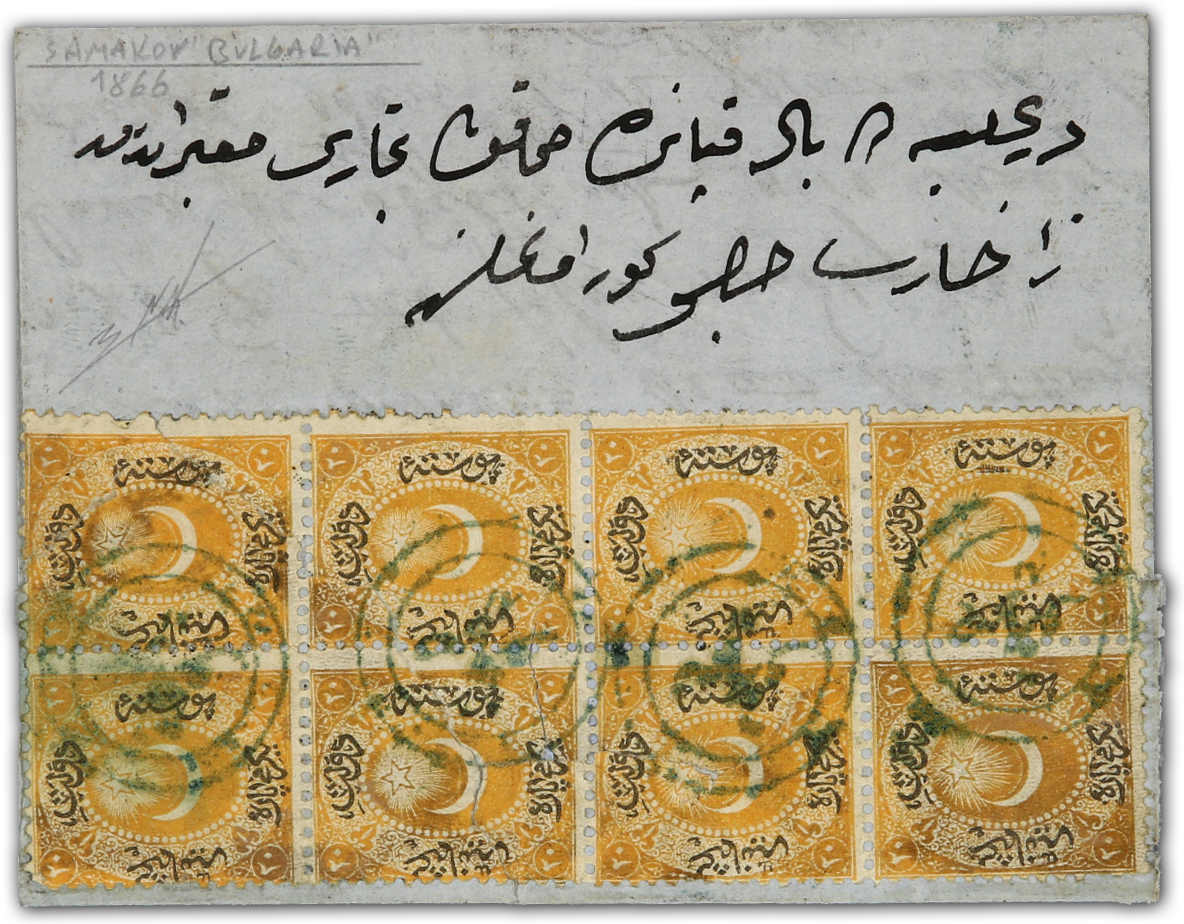 Samokov-Samakov: 1866, folded entire sent from Samokov to Constantinople bearing Duloz 1865 issue block of eight 20 para Orange-yellow, some stamps faulty, tied by very fine all Arabic double-circle "Samakov 81" handstamps in blue (Coles