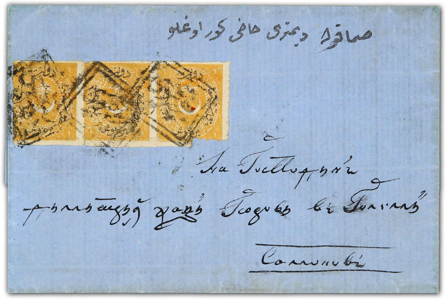 Samokov-Samakov: 1869/74 approx., folded entire sent from Constantinople to Samokov bearing Duloz 1869/71 issue strip of three 1 piastre yellow tied by very fine all Arabic double-box "Bahçe kapissi" handstamps in black (Coles & Walker