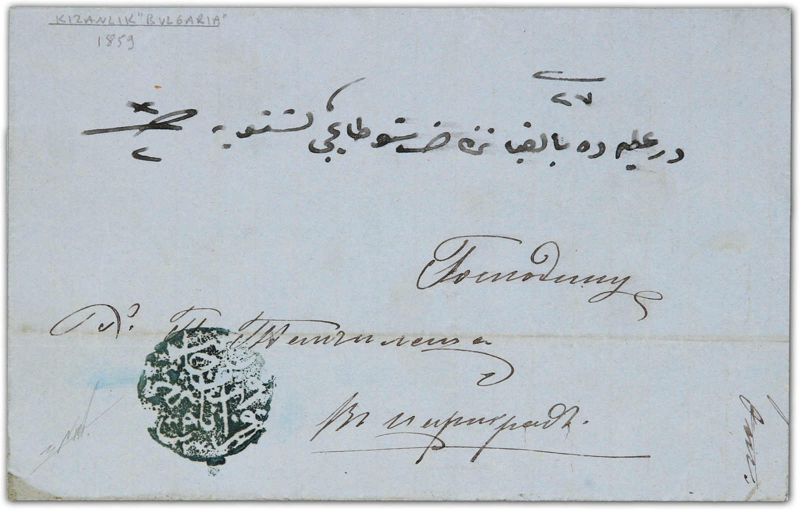 Kazanlak-Kizanlik: 1859, cover from Kazanlak to Constantinople showing fine negative all Arabic "An Canib-i Postahane-i Kizanlik 270" handstamp in greenish-black (Coles & Walker fig. 40).postage paid in cash, noted in manuscript notation