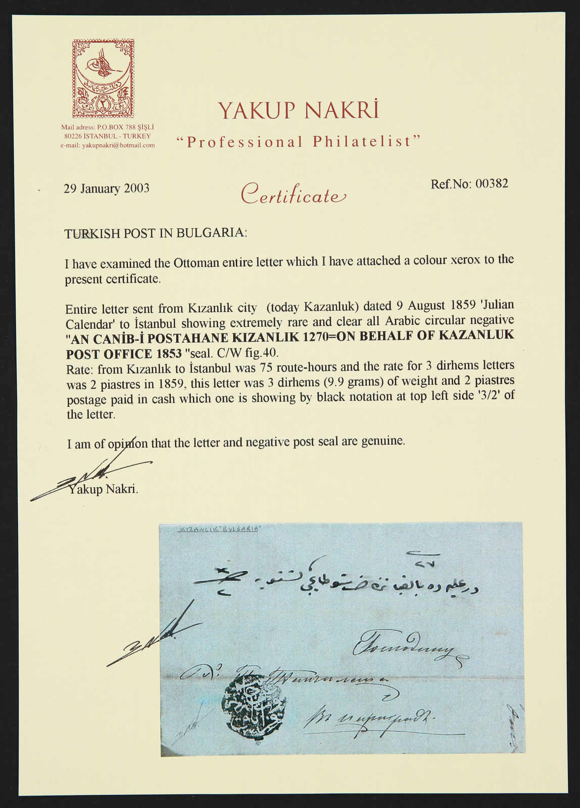 Kazanlak - Kızanlık: 1859, entire dated 9 August 1859 from Kazanlak to Constantinople showing extremely fine negative Arabic "An Canib-i Postahane-i Kizanlik 270" (on behalf of Kazanlak Post Office 1853) handstamp in black (Coles & Walker