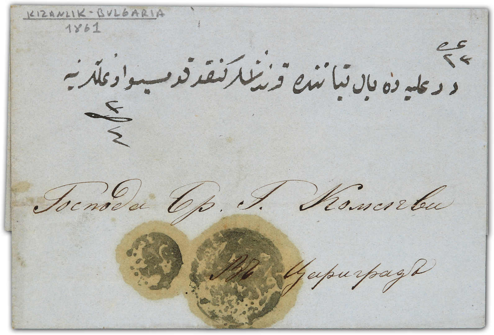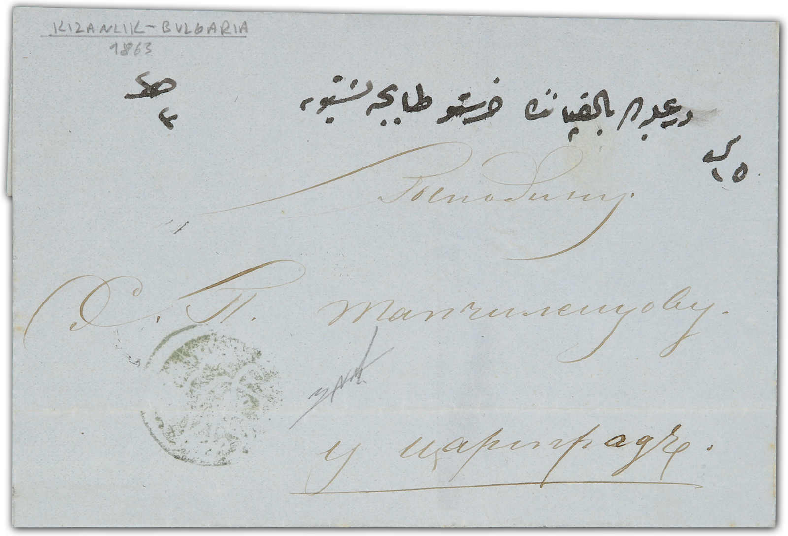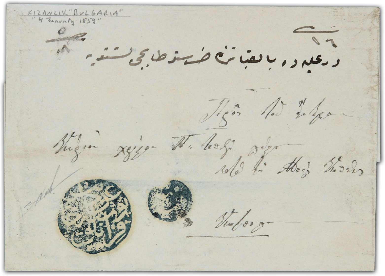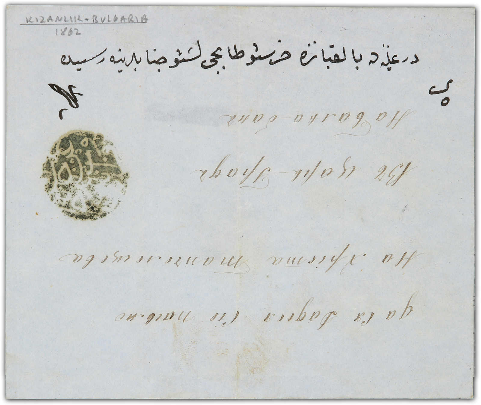 Kazanlak-Kizanlik: 1862, folded cover from Kazanlak to Constantinople showing very fine negative all Arabic "An Canib-i Postahane-i Kizanlik 270" handstamp in black (Coles & Walker fig. 40). at top left notation of the weight 3 Dirhem /
