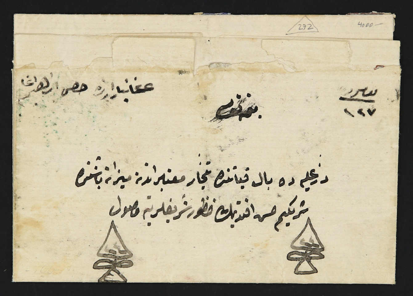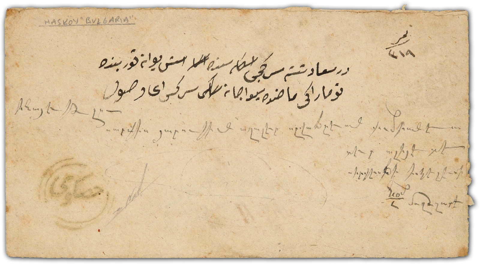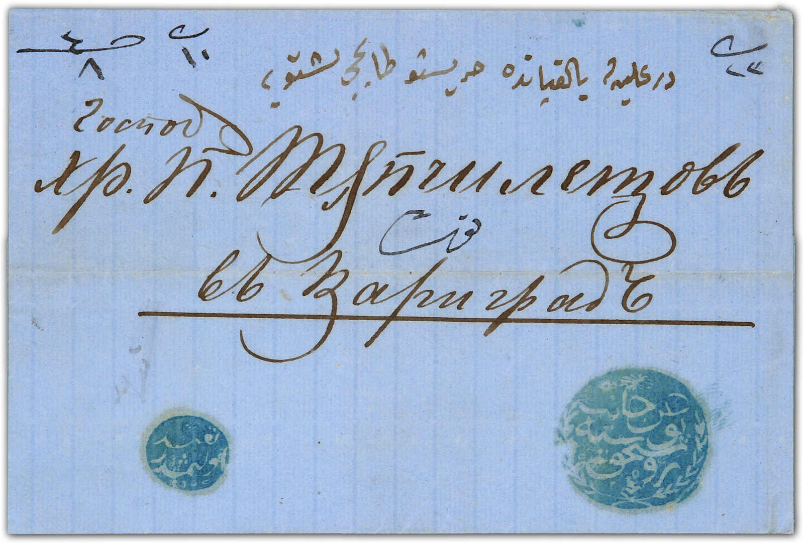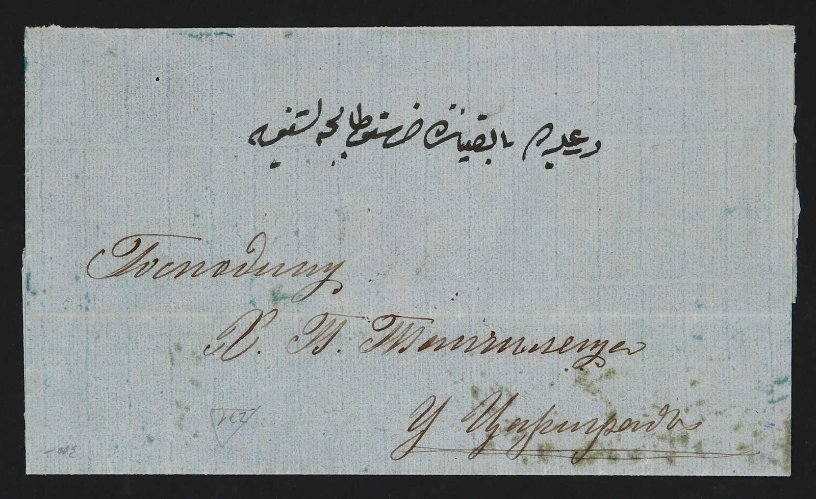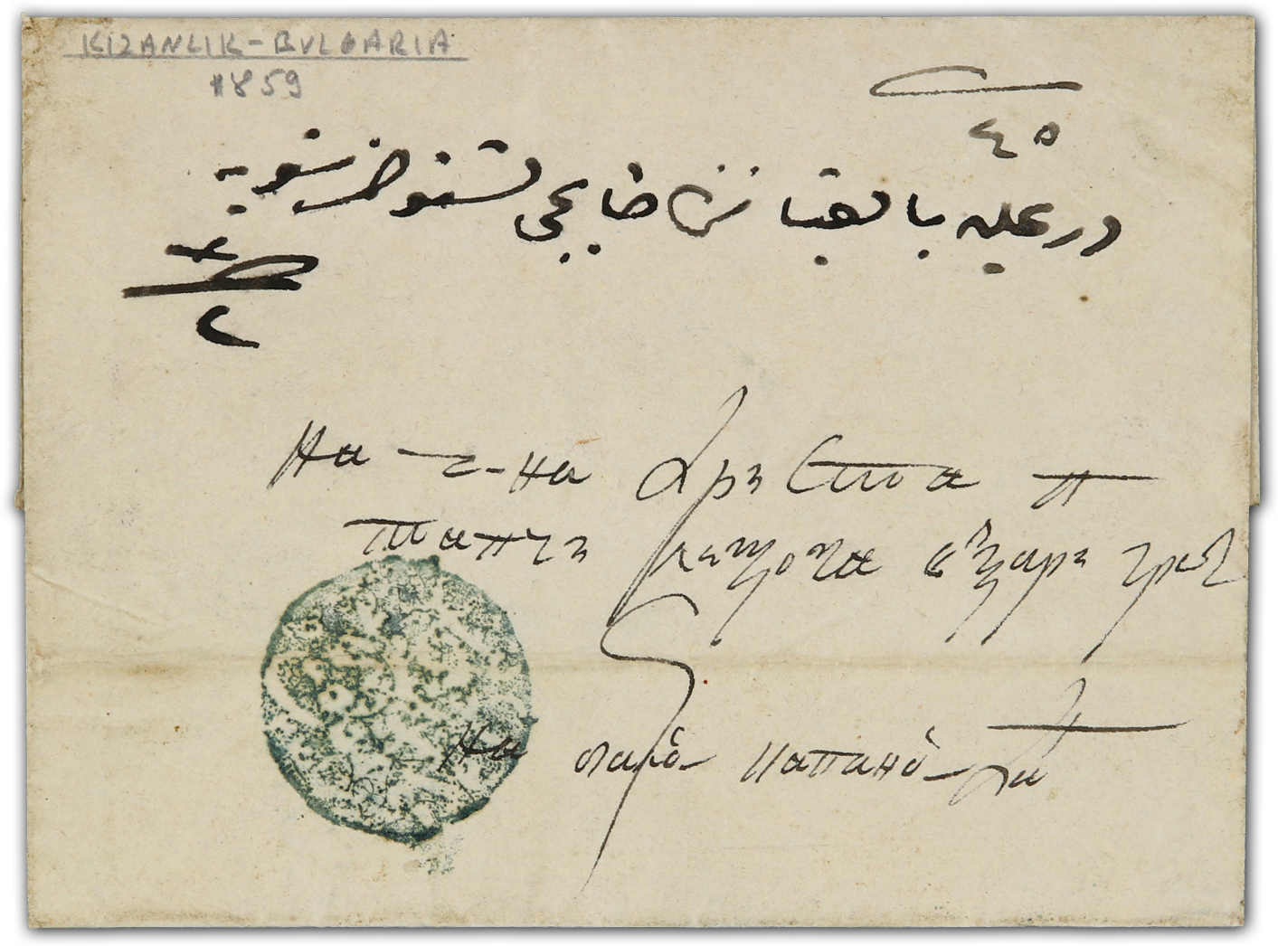 Kazanlak-Kizanlik: 1862, folded cover from Kazanlak to Constantinople showing very fine negative all Arabic "An Canib-i Postahane-i Kizanlik 270" handstamp in black (Coles & Walker fig. 40). at top left notation of the weight 3 Dirhem /