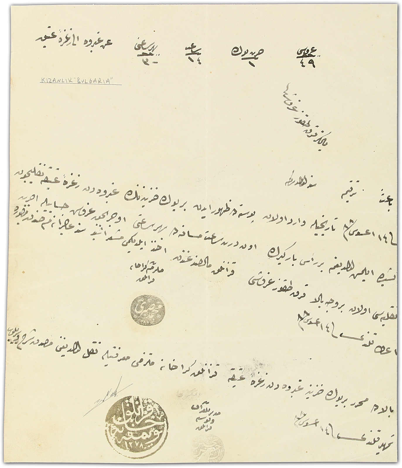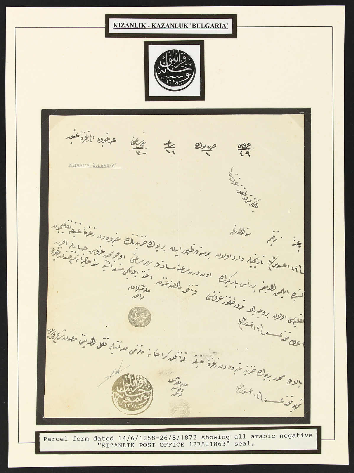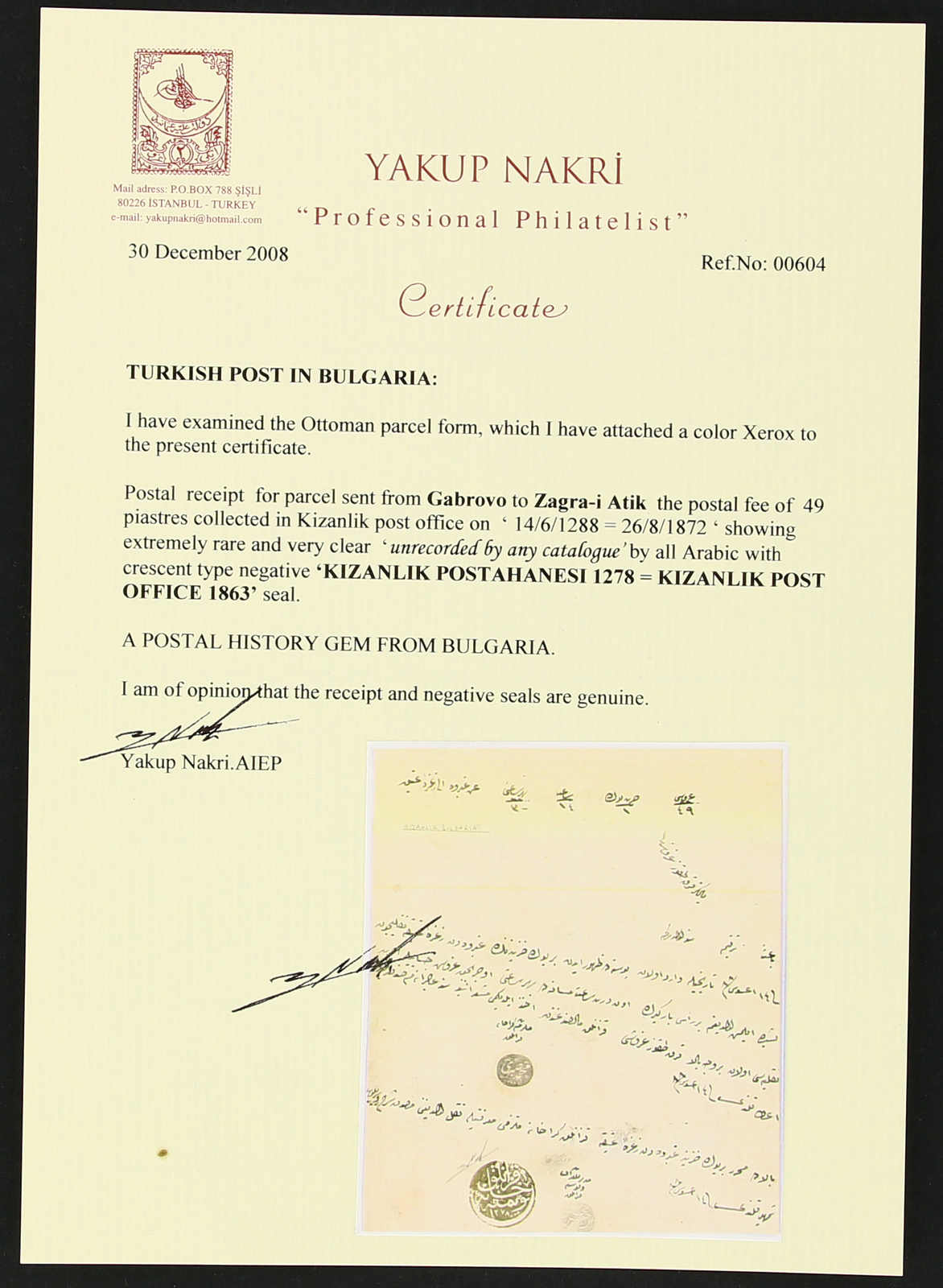 Kazanlak-Kızanlık: 1872, parcel form dated 14 Ağustos 1288 = 26 August 1872 for a parcel sent from Gabrovo to Kazanlik showing superb strike of Arabic negative with Crescent "Postahane-i Kizanlik 1278" (Post Office Kazanlak 1861) in black