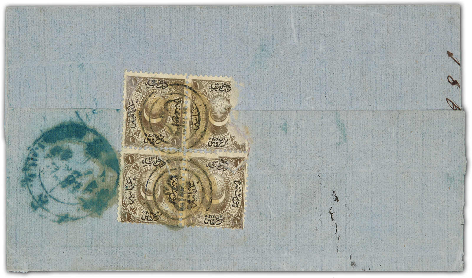 Kazanlak-Kizanlik: 1866, cover from Kazanl#k to Constantinople bearing on reverse 1865 Duloz 1 pi. grey in a block of four, two stamps damaged during the opening, tied by all Arabic double-circle "Kizanlik 81" handstamps (Coles & Walker