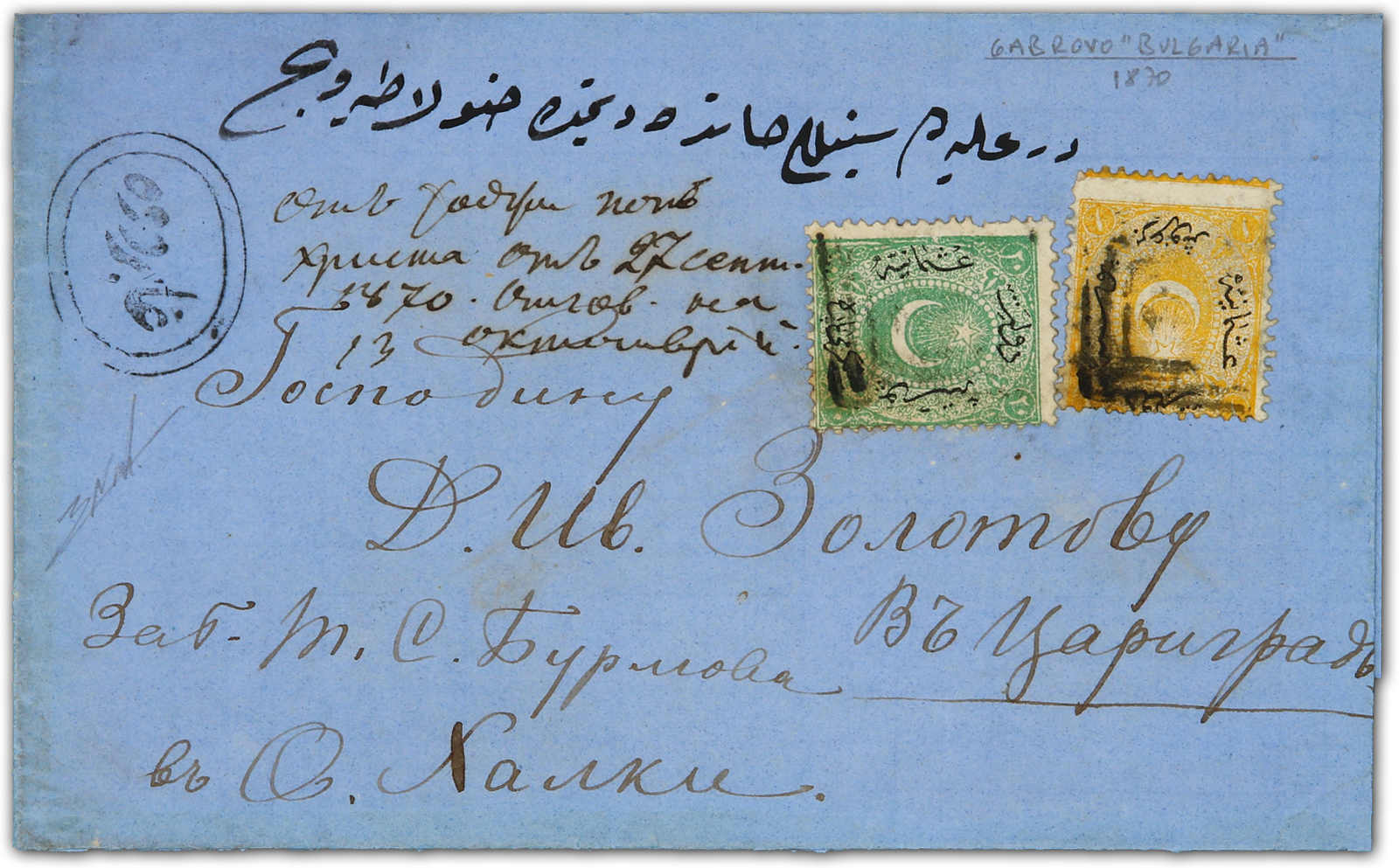 Gabrovo - Gabrovo: 1870, entire from Gabrovo to Constantinople with extremely rare and fine oval Arabic "GABROVA" despatch handstamp (Coles & Walker fig. 20), charged postage due on arrival by Duloz 1868 20 para green and 1 piastre yellow