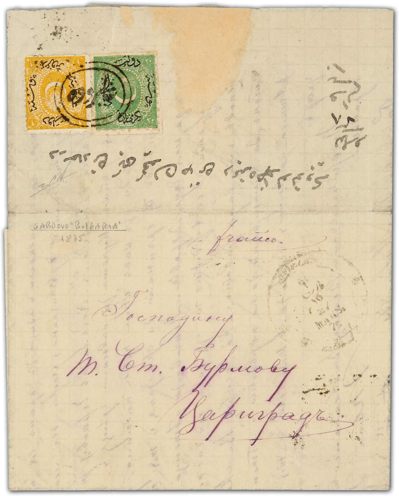 Gabrovo - Gabrovo: 1875, entire from Gabrovo dated 10 March 1874 internally, mailed to Constantinople franked on reverse with Duloz 1868 1 pi. brownish yellow and 1869/71 20 para green tied by extremely rare Arabic oval "GABROVO"
