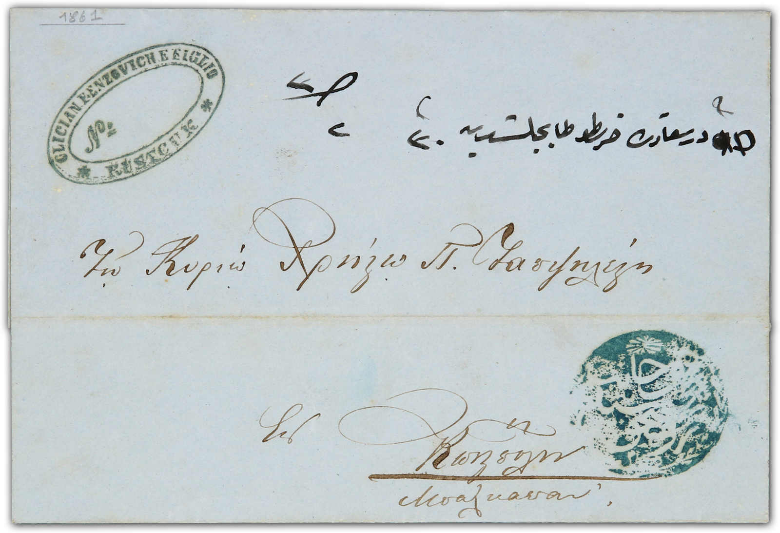 Ruse - Rusçuk: 1861, entire from Ruse to Constantinople showing very fine strike of Arabic negative "An Canib-i Posta Rusçuk 265" (on behalf of Ruse Post Office 1849) handstamp (Coles & Walker fig. 58'), showing weight 3 Dirhem / postal