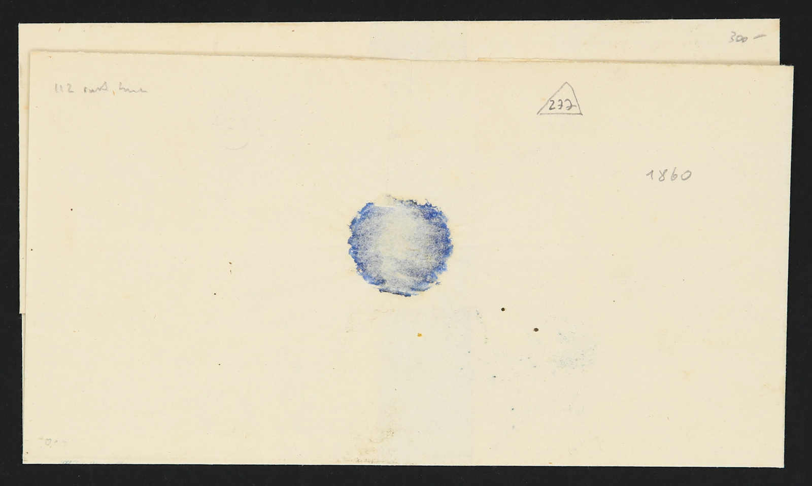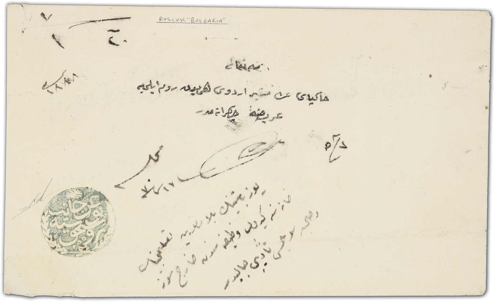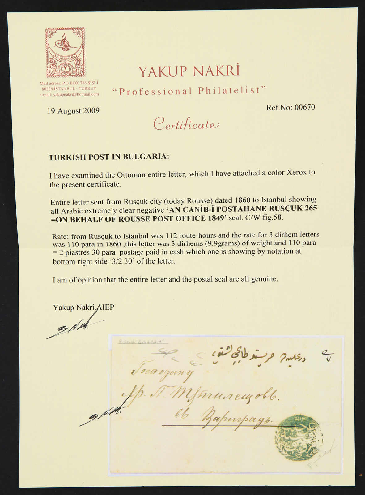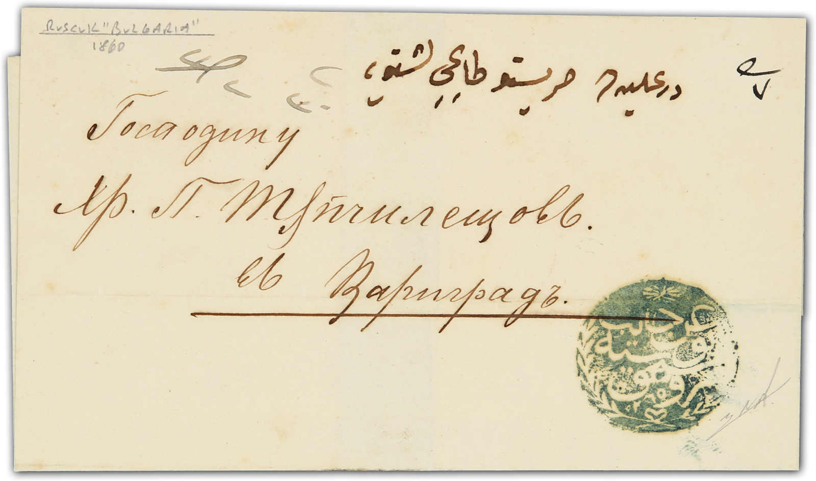 Ruse - Rusçuk: 1860, entire from Ruse to Constantinople showing superb strike of Arabic negative "An Canib-i Posta Rusçuk 265" (on behalf of Ruse Post Office 1849) handstamp (Coles & Walker fig. 58), showing weight 3 Dirhem / postal