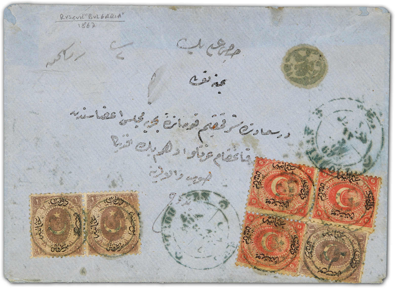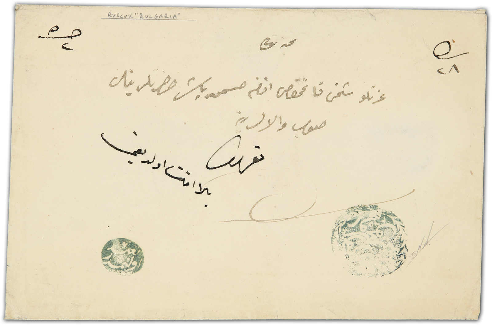 handstamps (Coles & Walker fig. 20) in black, obverse shows bilingual Stamboul arrival cds, an Ottoman and Bulgarian rarity, signed Nakri (Image)
