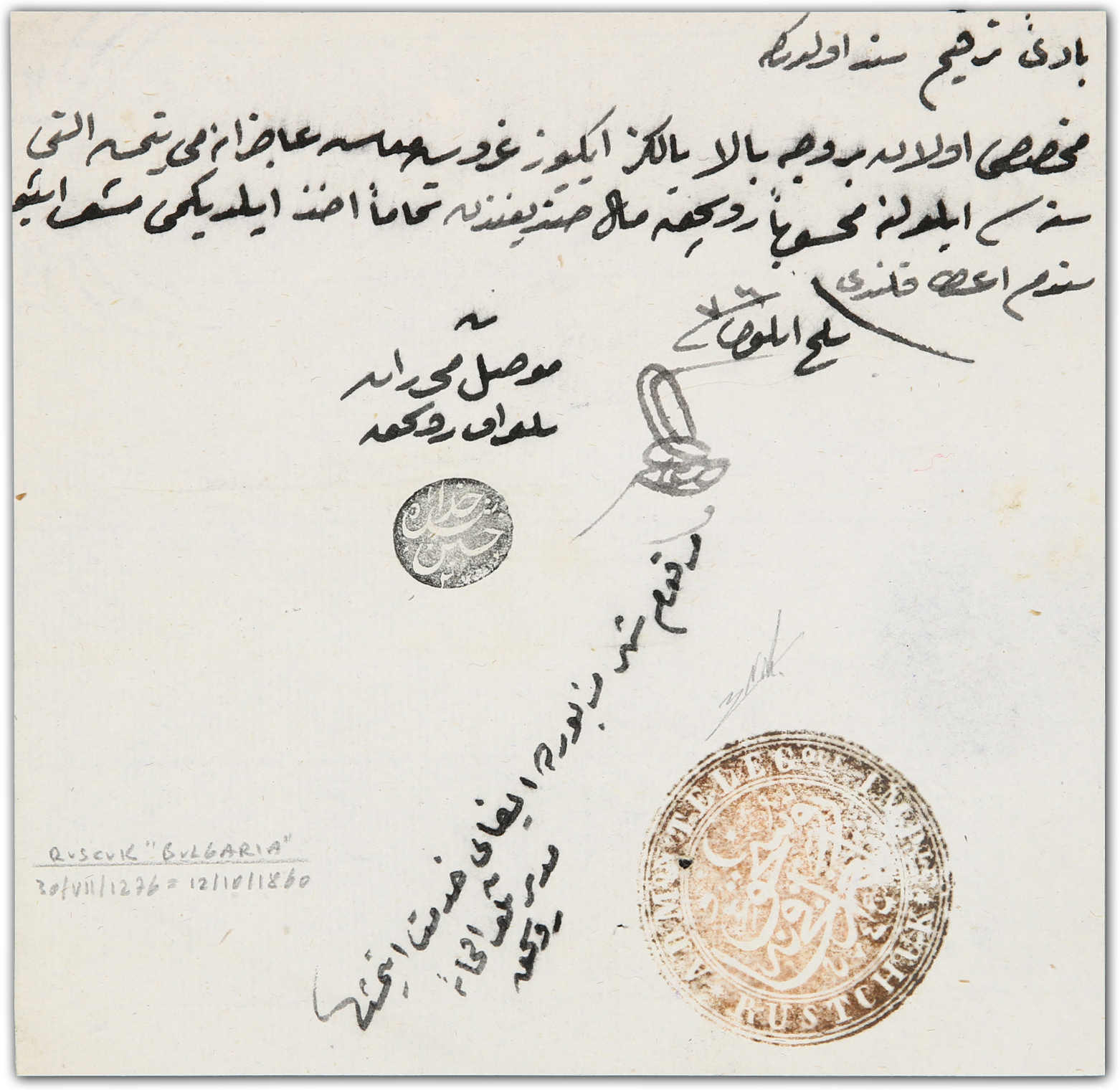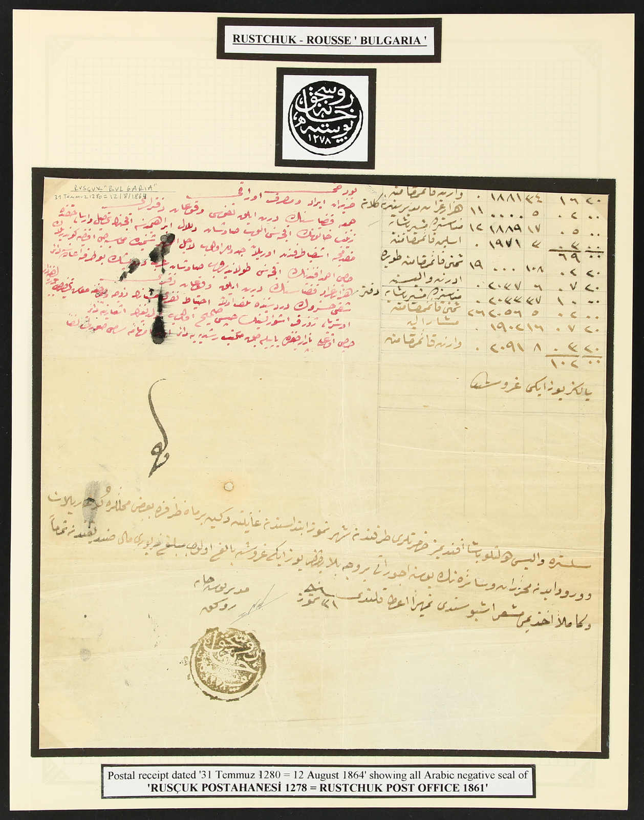 Ruse - Rusçuk: 1864, postal receipt of 102 piastres for several letters sent dated 31 Temmuz 1280 = 12 August 1864 showing superb strike of Arabic negative with crescent *Rusçuk Postahanesi 1278" (Post Office Russe 1861) handstamp in