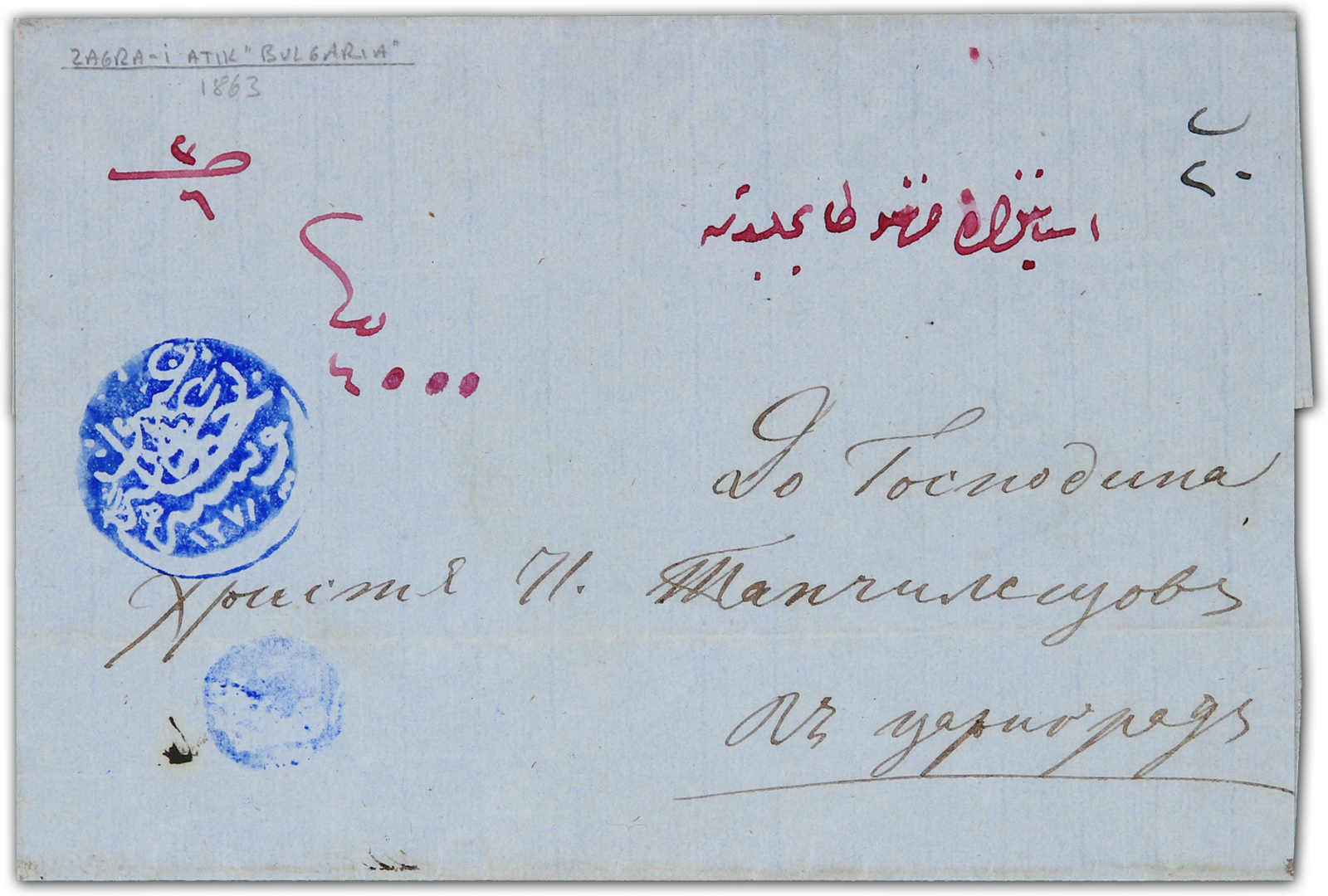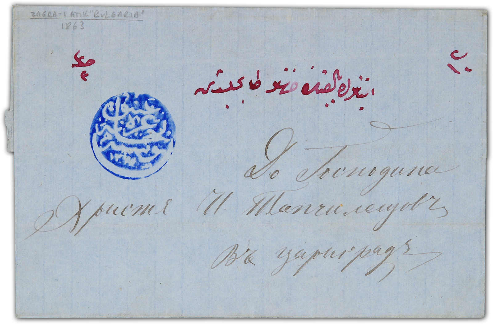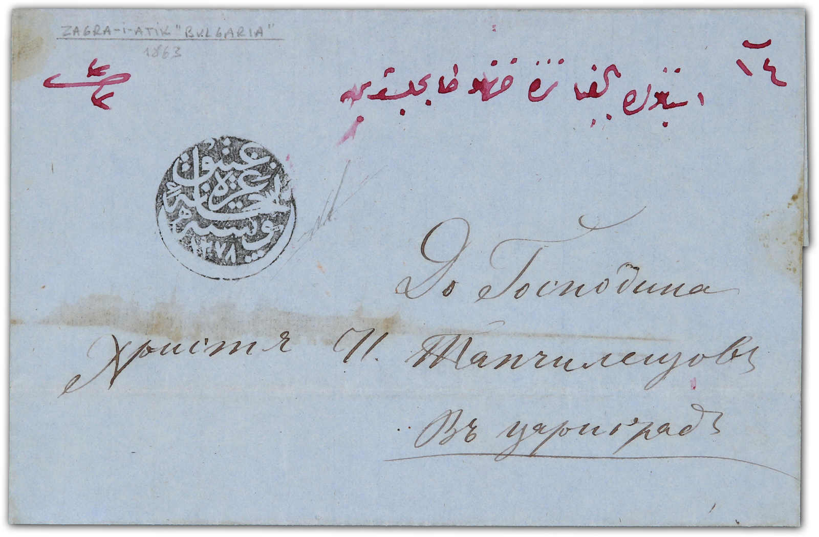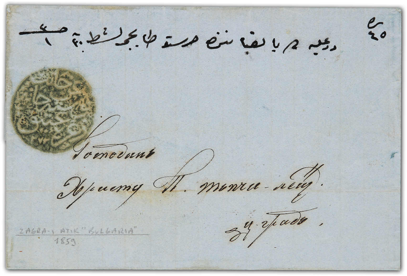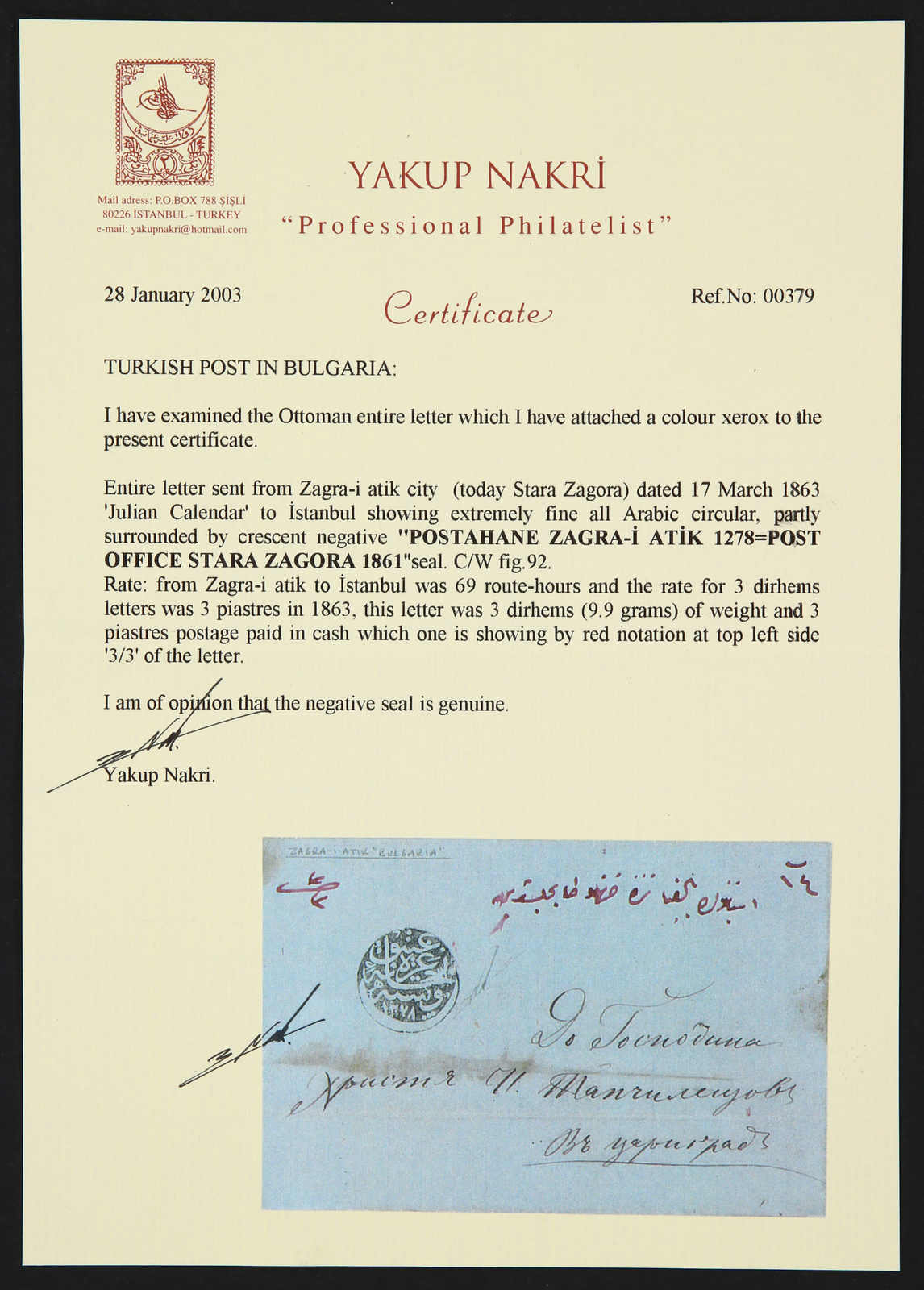 Stara Zagora - Zagra-i Atik: 1863, entire from Stara Zagora to Constantinople showing superb strike of Arabic negative with Crescent "Postahane Zagra-i Atik 1278" (Post Office Stara Zagora 1861) handstamp in blue (Coles & Walker fig. 92),