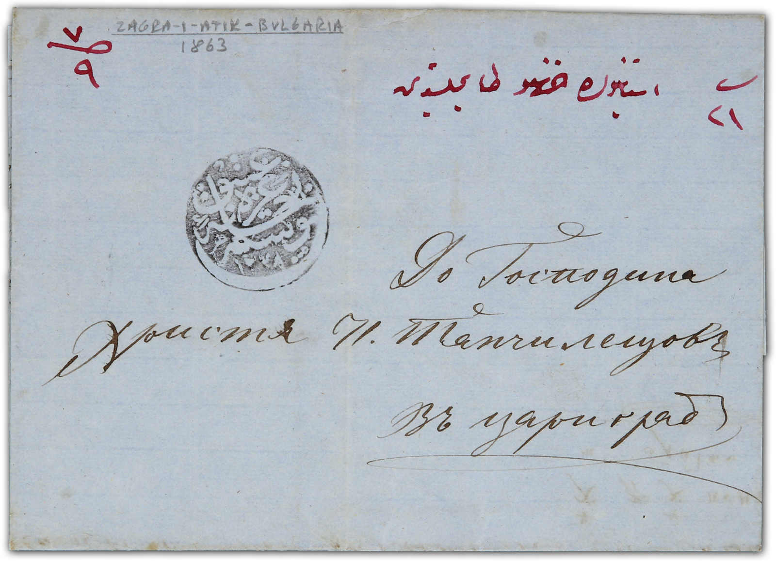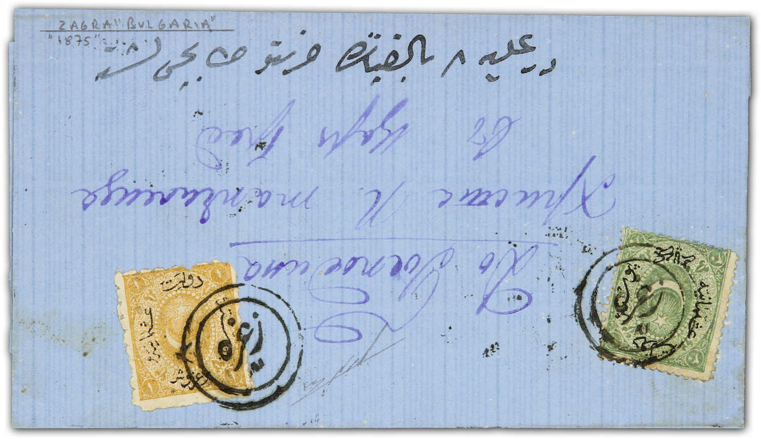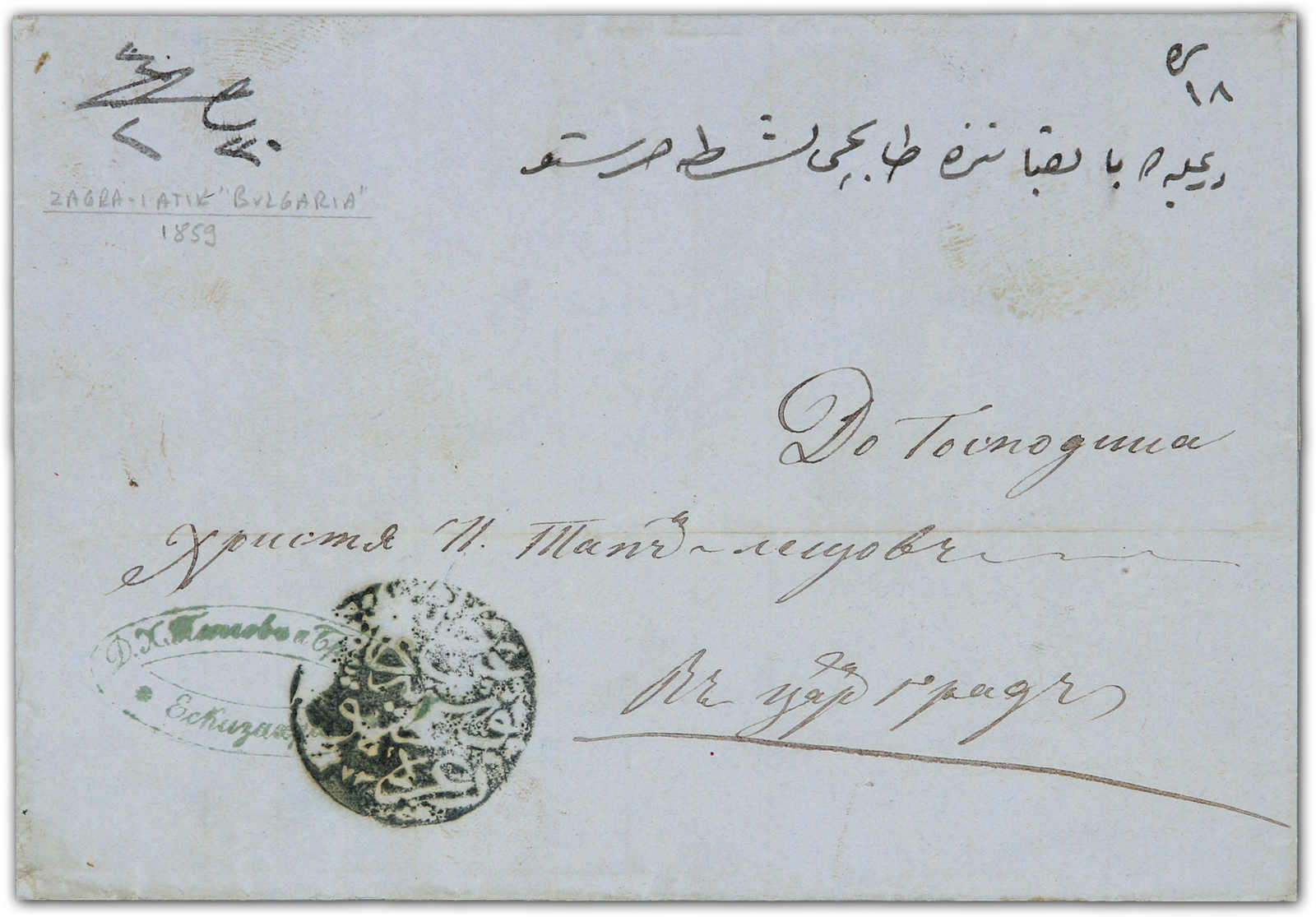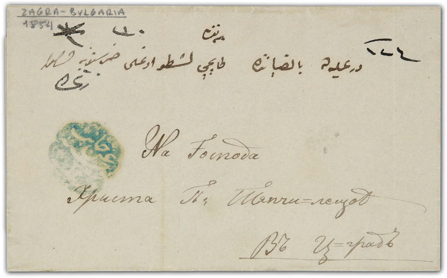 Stara Zagora - Zagra-i Atik: 1863, entire from Stara Zagora to Constantinople showing superb strike of Arabic negative with Crescent "Postahane Zagra-i Atik 1278" (Post Office Stara Zagora 1861) handstamp in blue (Coles & Walker fig. 92),