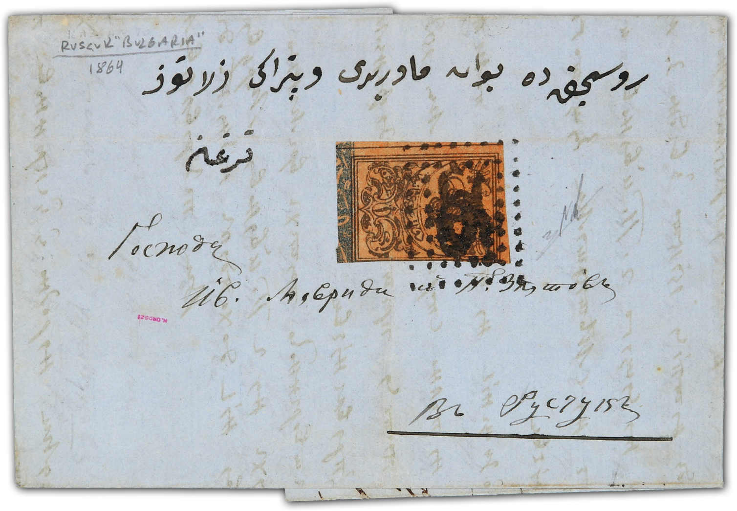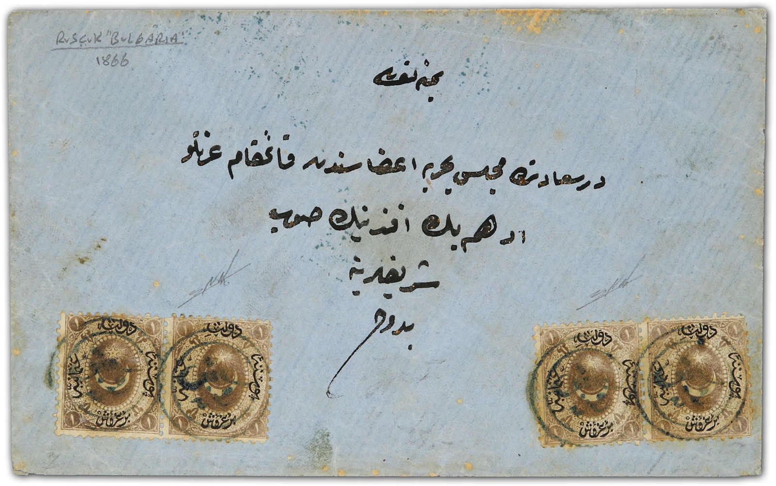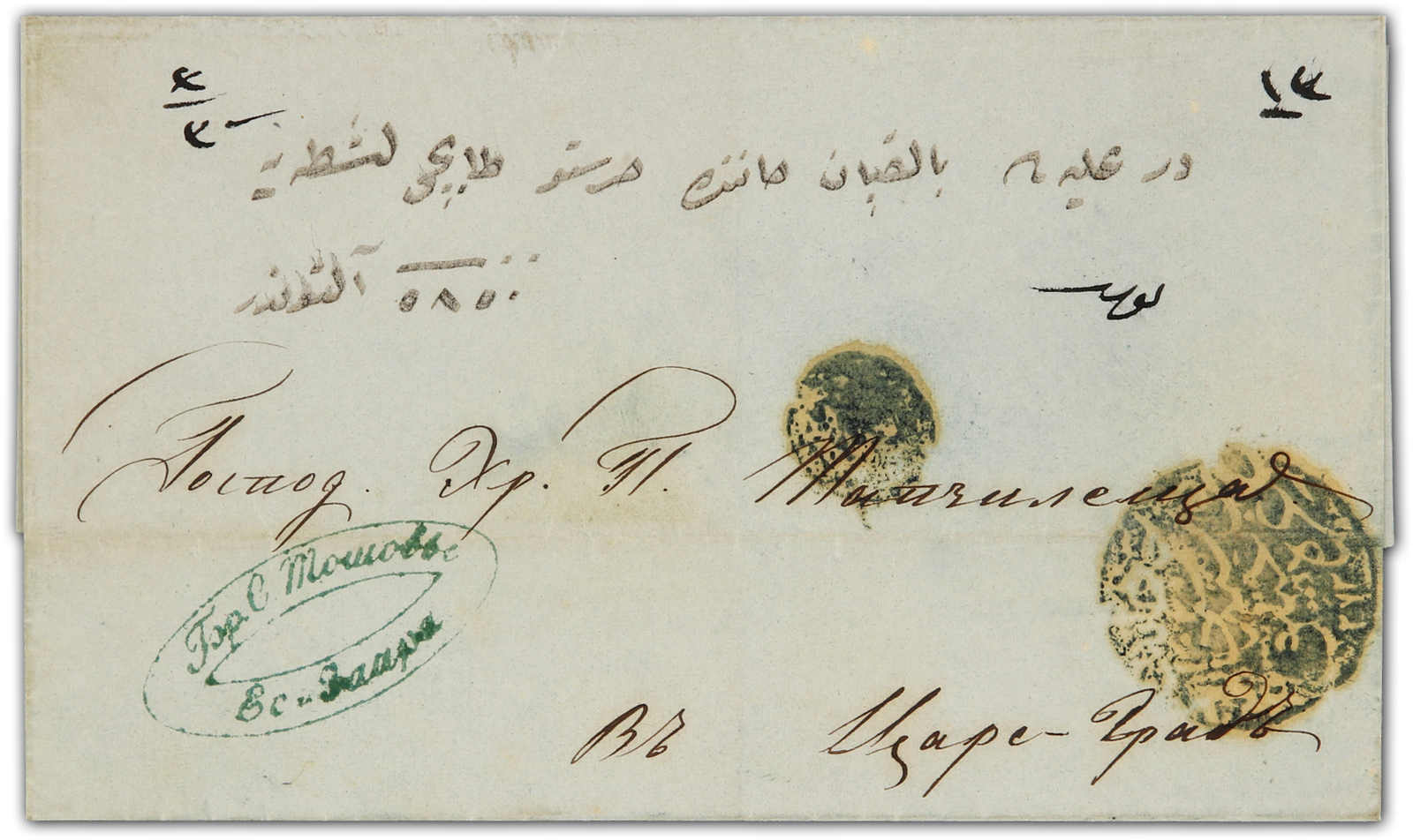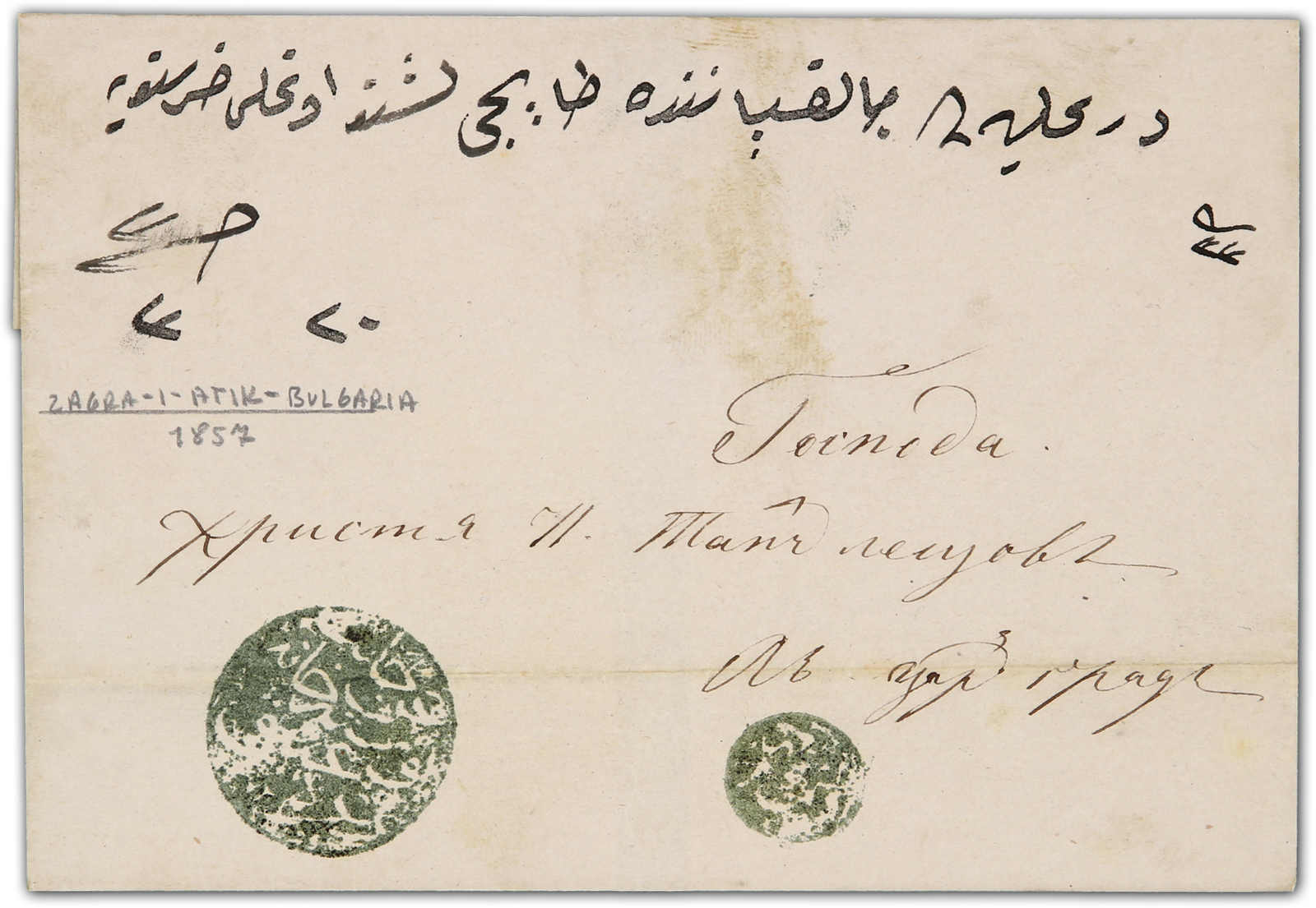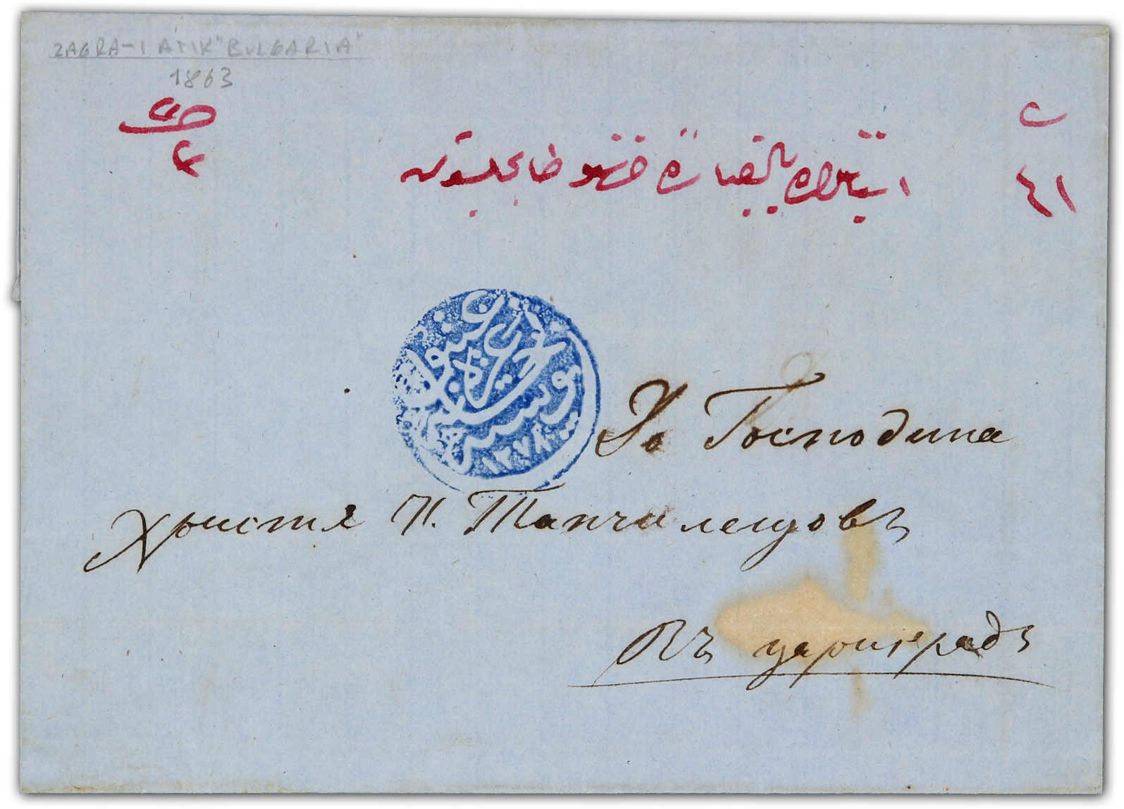 Stara Zagora - Zagra-i Atik: 1863, entire from Stara Zagora to Constantinople showing superb strike of Arabic negative with Crescent "Postahane Zagra-i Atik 1278" (Post Office Stara Zagora 1861) handstamp in blue (Coles & Walker fig. 92),