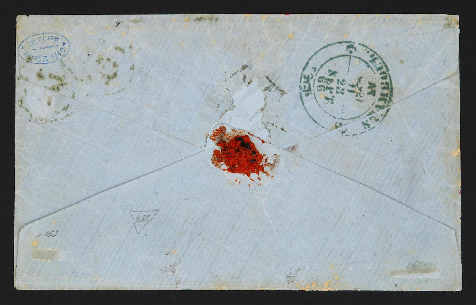 handstamp in black (Coles & Walker fig. 92), weight 7 Dirhem / postal charge 9 piastres in red manuscript at upper left (Image)