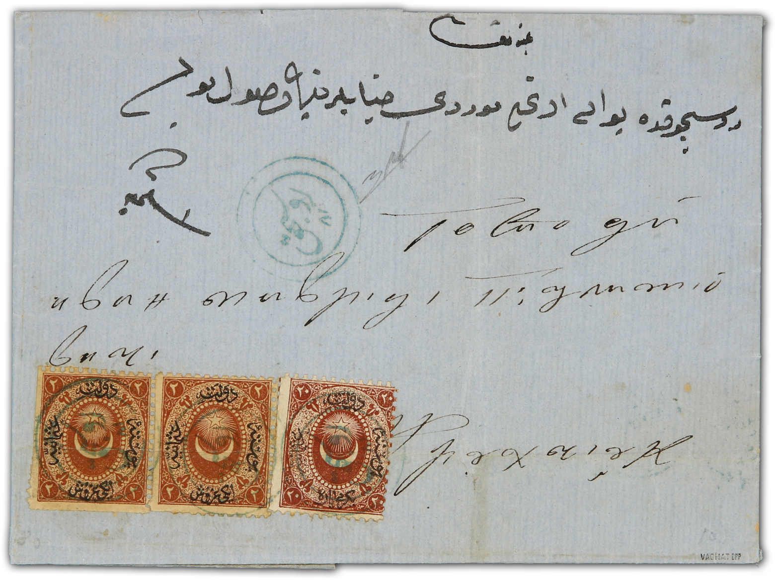 all Arabic negative "An Canib Posta-i Deraliyye 268" blue handstamp (Coles & Walker fig. 8), Arabic manuscript "Zagra" at top left and weight 3 Dirhem / postal charge 1 piastre 20 paras in manuscript (Image)
