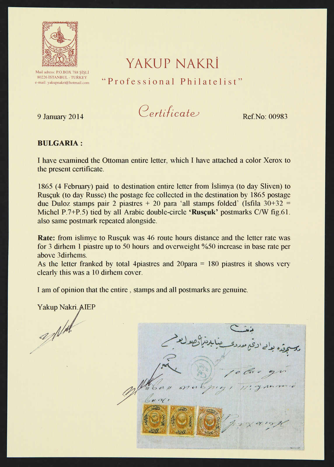 Ruse-Rusçuk: 1865 (4 February), paid to destination entire letter from Islimye (To day Sliven) to Russe the postage fee collected in the destination by 1865 postage Due Duloz stamps pair 2 piastres and 20 para brown, folded, tied by all
