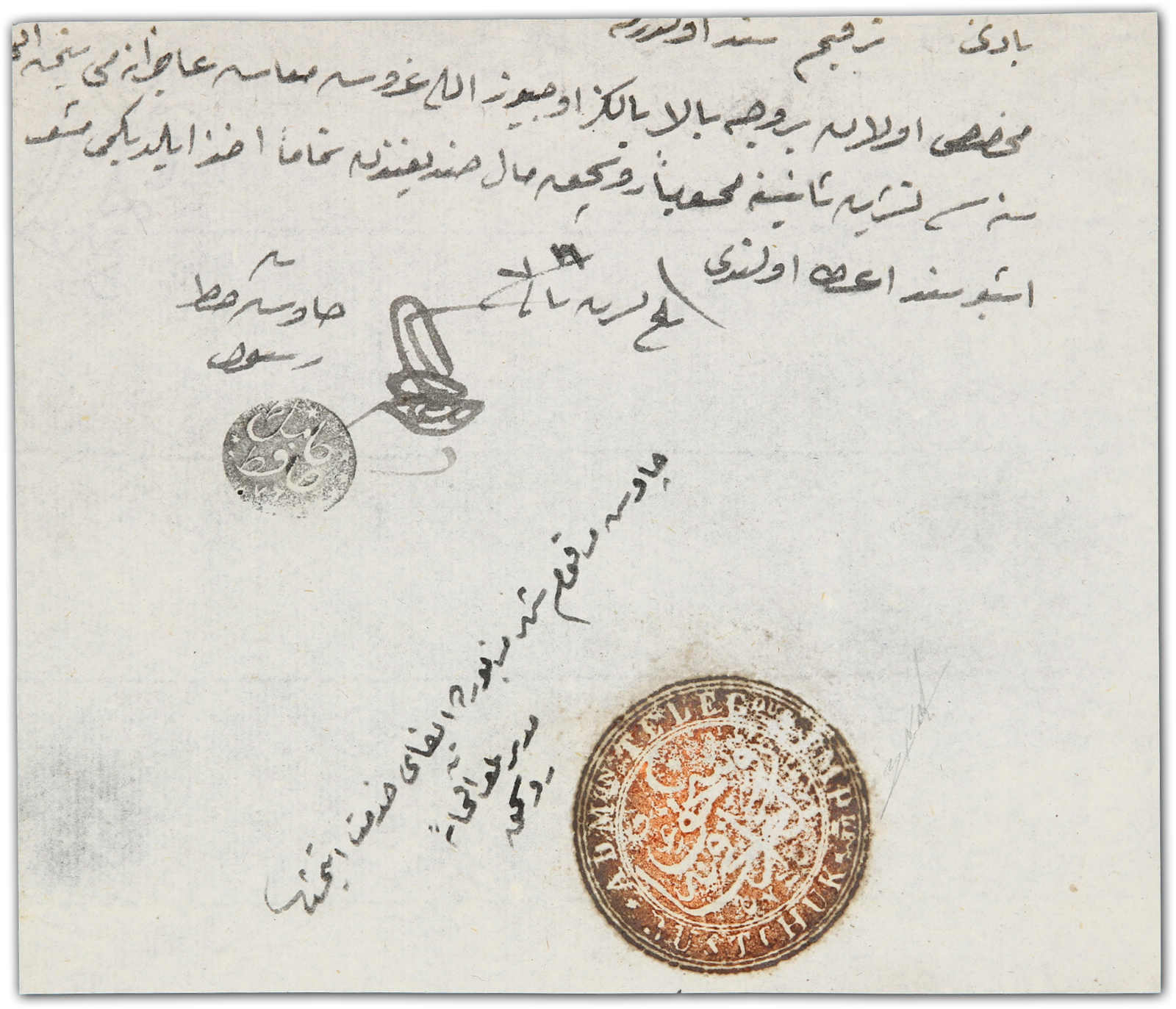 (Coles & Walker fig. 91), with small negative "Taahhüt olunmuştur" (has been registered) seal alongside and weight 3 Dirhem / rate 3 piastres 20 paras in manuscript at top left (Image)