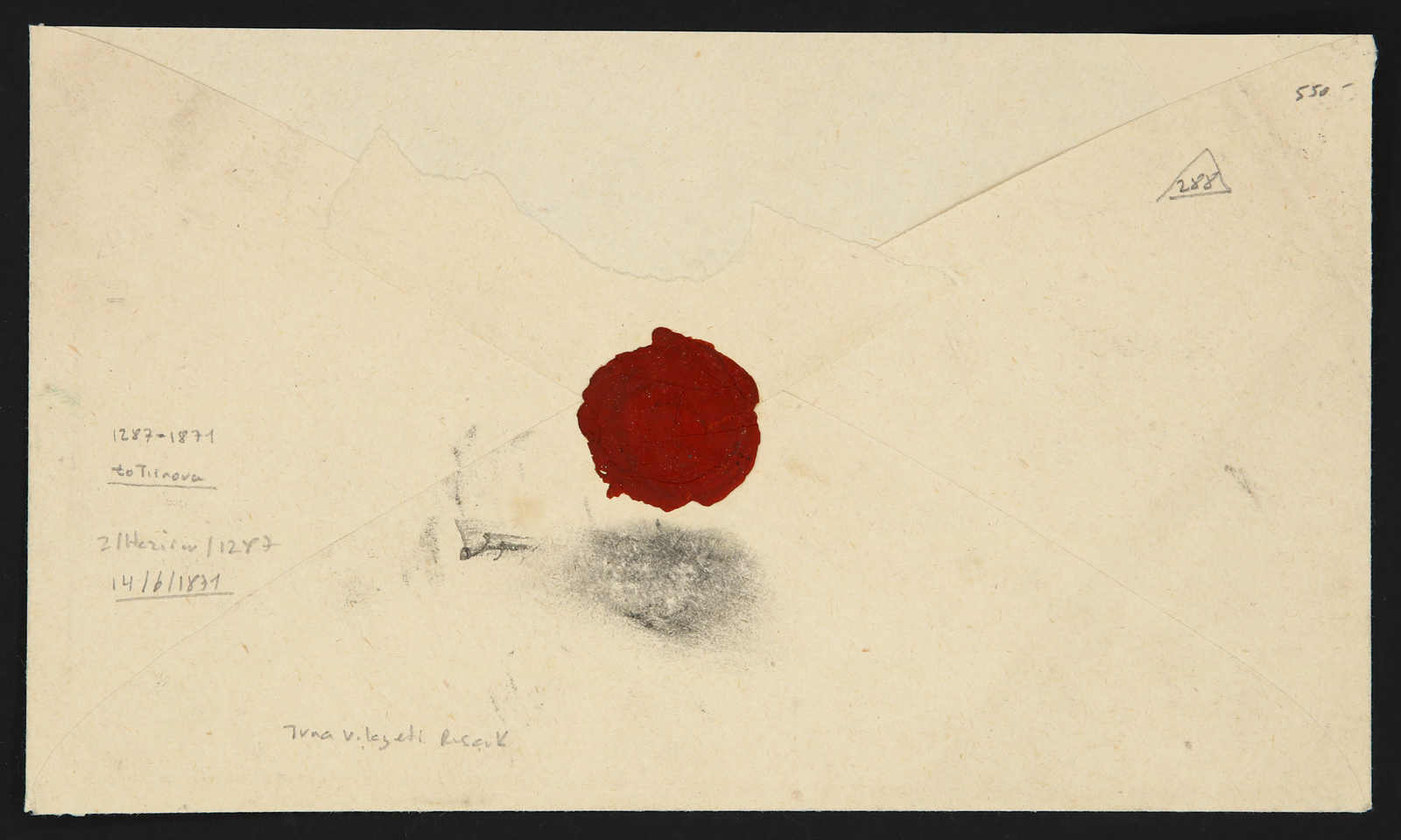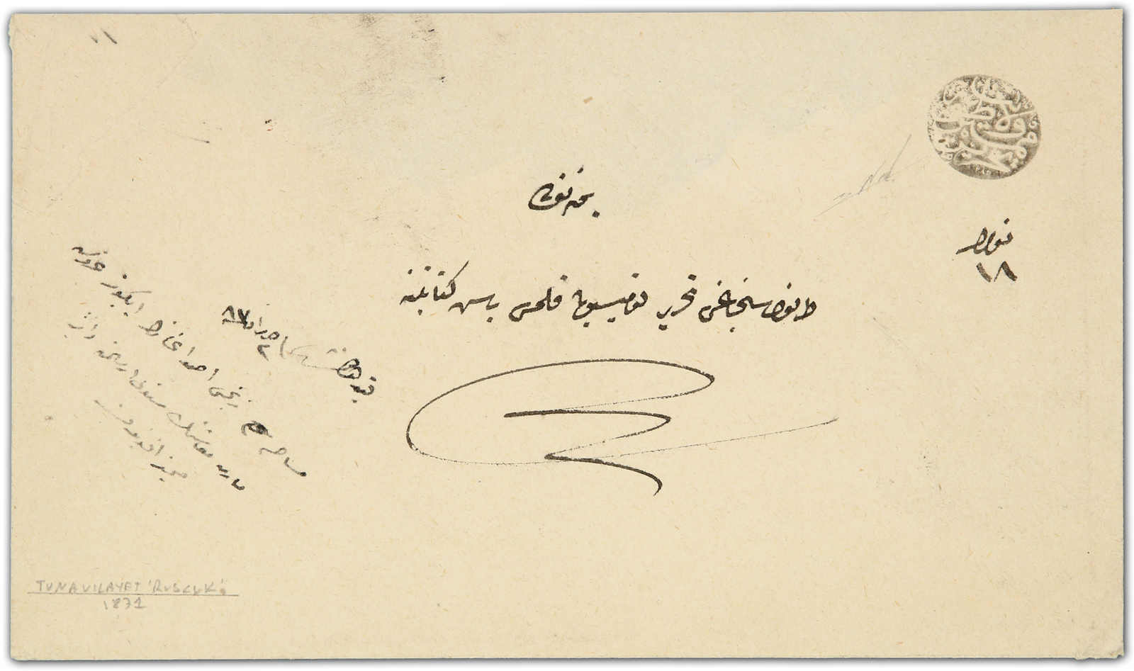 Ruse-Rusçuk: 1871, official cover from Ruse to Tirnovo showing all Arabic black negative "Tuna Vilayet" (="Danube Province/Ruse") seal, unrecorded by any catalogue, signed Nakri (Image) (imagea)