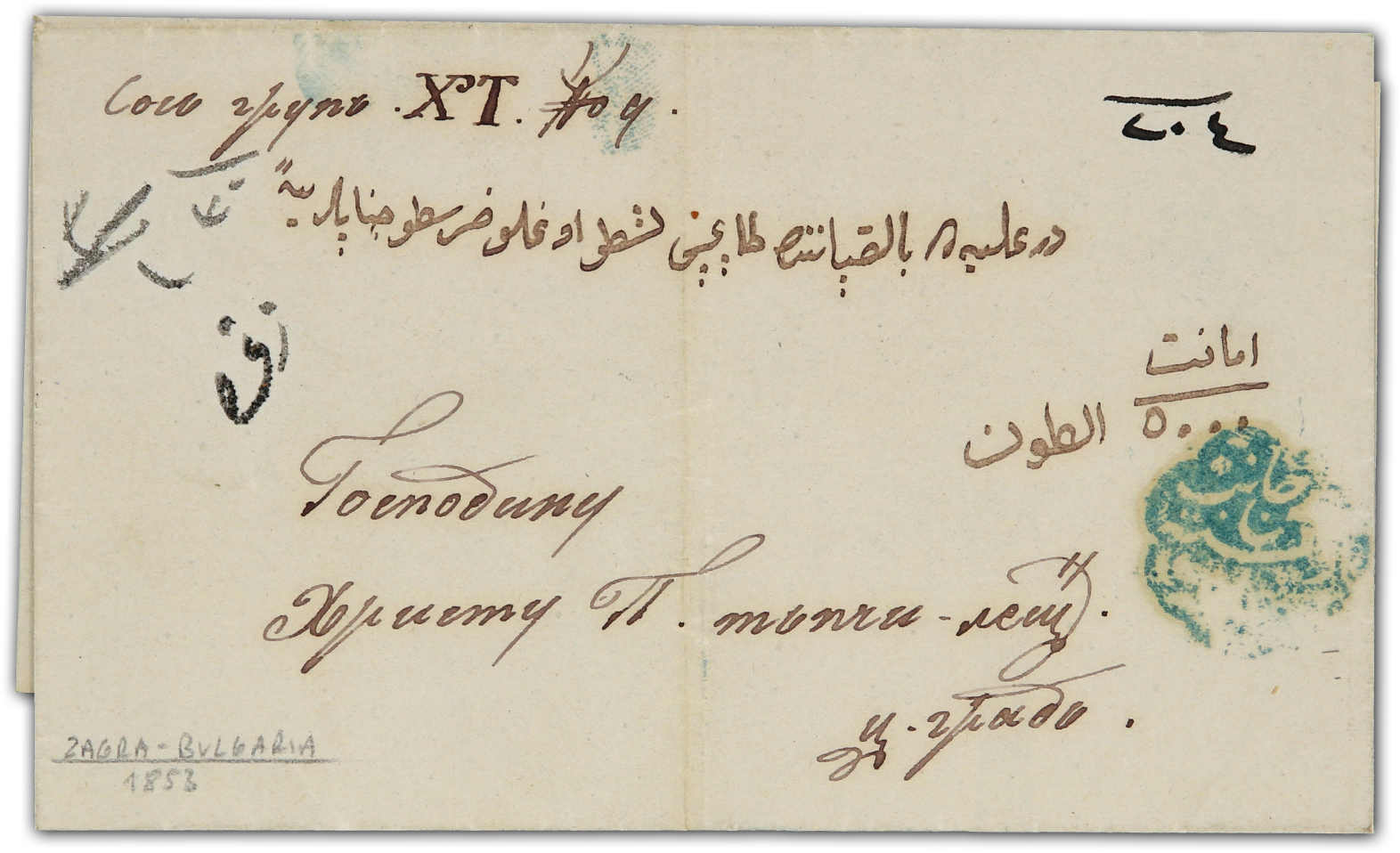 Stara Zagora - Zagra-i Atik: 1853, entire from Stara Zagora to Constantinople struck on arrival with all Arabic negative "An Canib Posta-i Deraliyye 268" blue handstamp (Coles & Walker fig. 8), with Arabic manuscript "Zagra" at top left