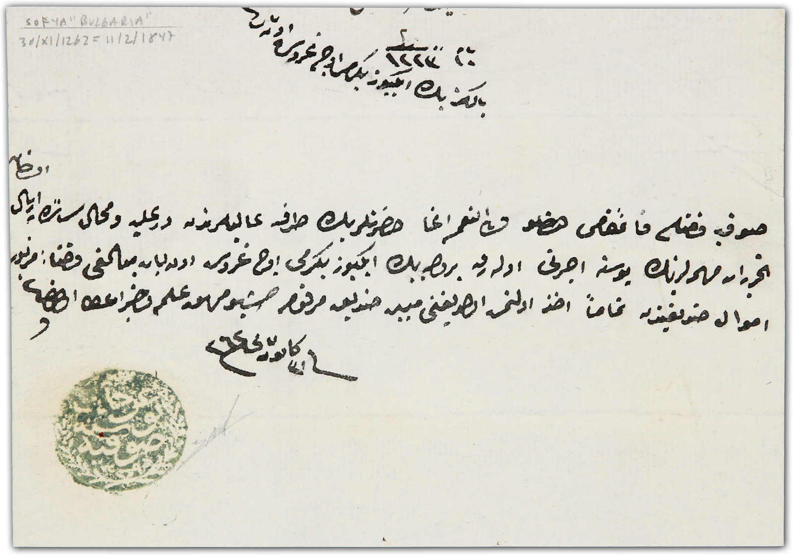 Sofia - Sofya: 1847, postal receipt of 1223 piastres 10 paras for several letters sent dated 30 Kanun-i Sani 1262 = 11 February 1847 showing superb strike of Arabic negative with ornament "An Canib-i Posta Sofya 259" (on behalf of Sofia