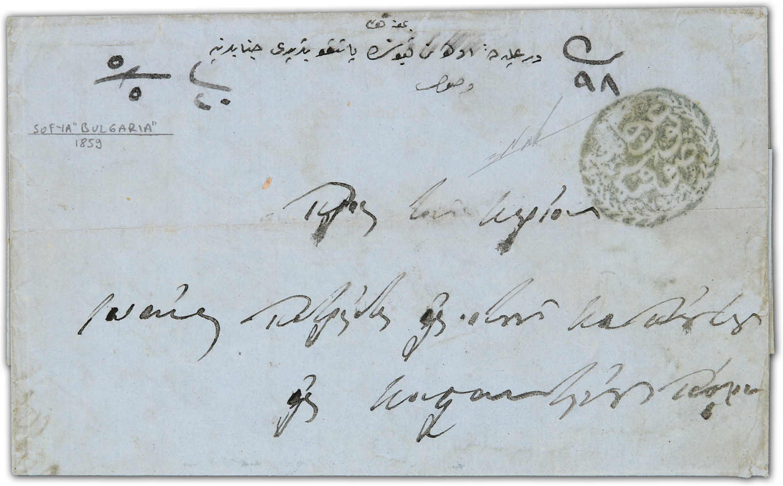 Sofia - Sofya: 1859, entire from Sofia to Constantinople showing very fine strike of Arabic negative with ornament "An Canib-i Posta Sofya 259" (on behalf of Sofia Post Office 1843) handstamp in black (Coles & Walker fig. 73), at top left