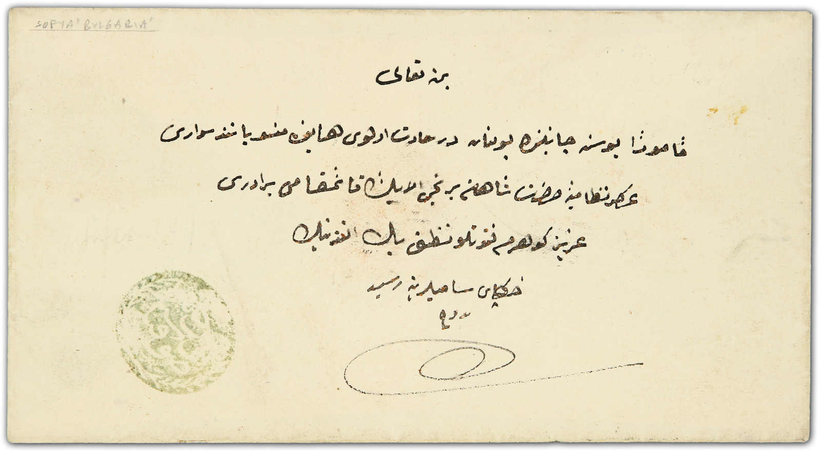 Sofia-Sofya: cover from Sofia to Constantinople showing fine strike of Arabic negative with ornament "An Canib-i Posta Sofya 259" (on behalf of Sofia Post Office 1843) handstamp in greenish-black (Coles & Walker fig. 73) (Image)
