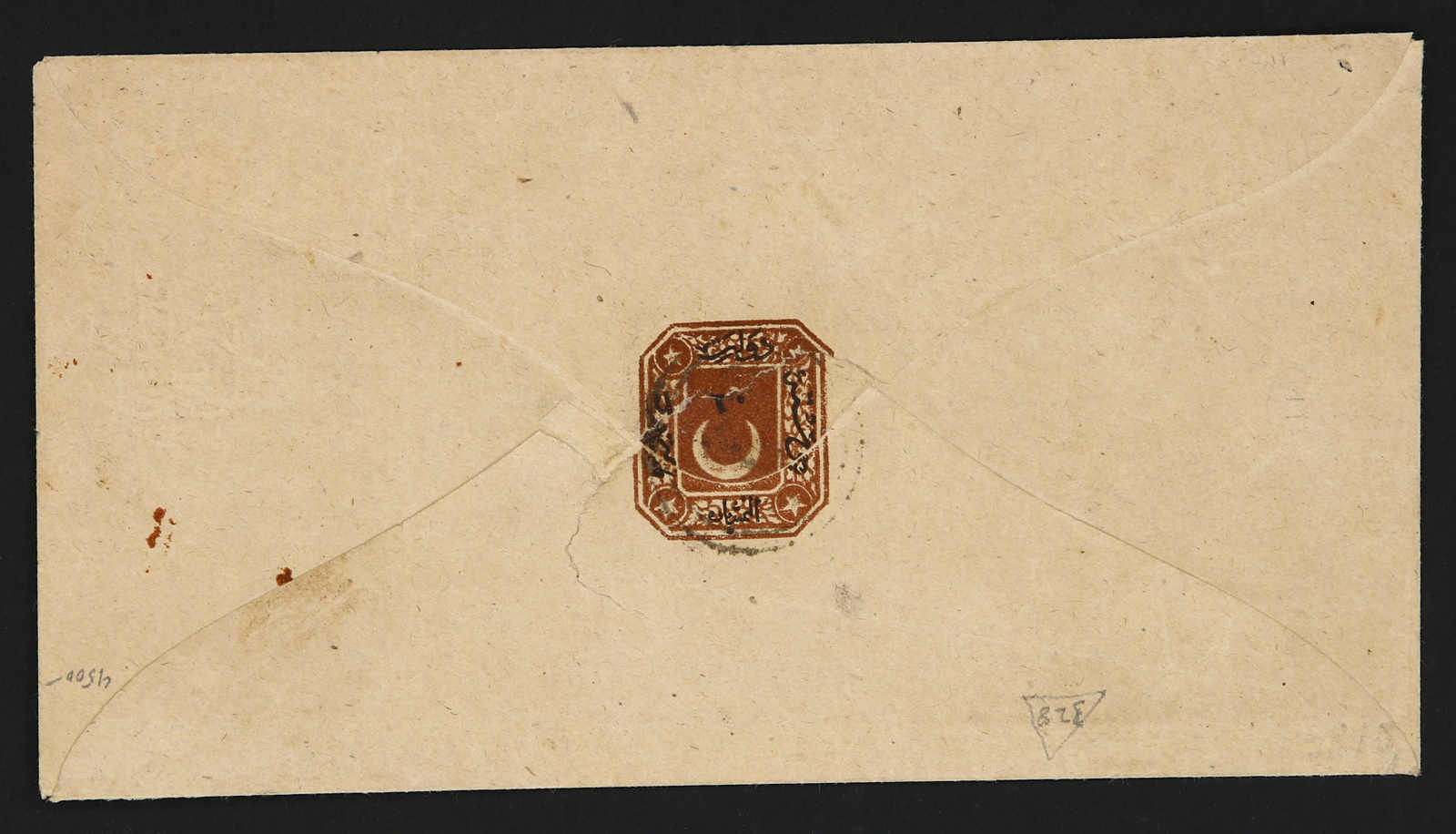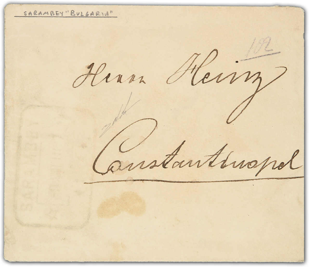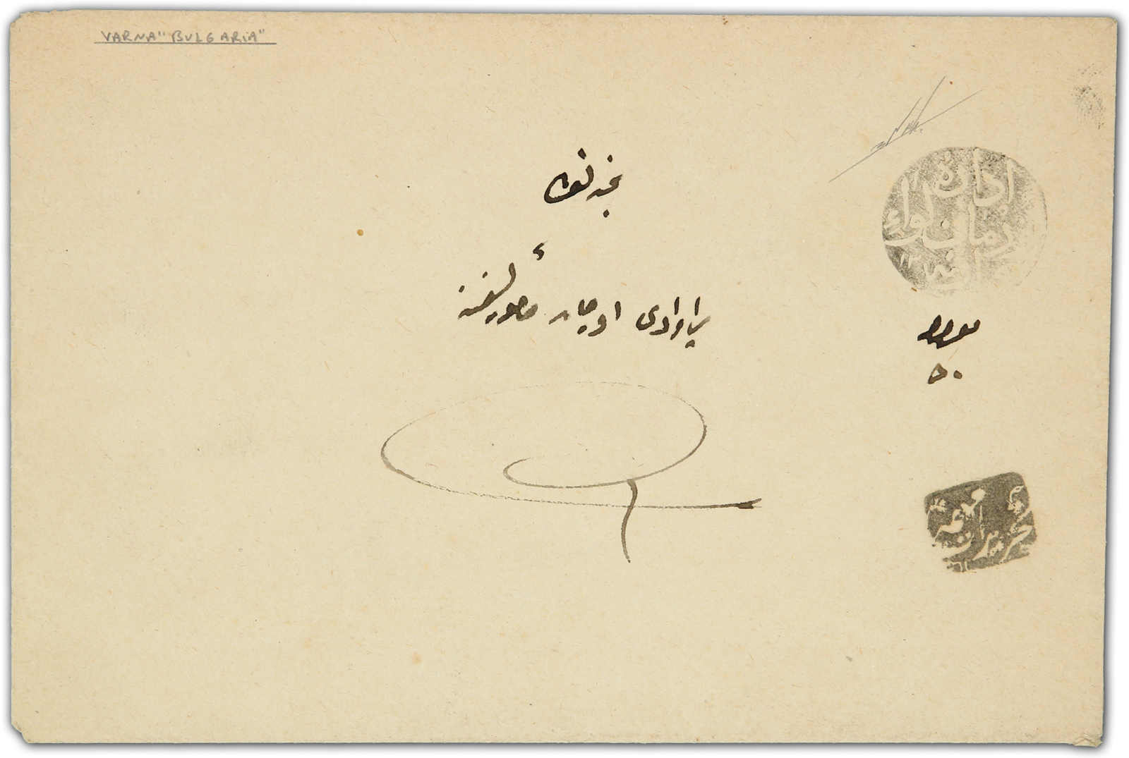 Varna: official cover from Varna to Prevadi showing Arabic negative "Varna Orman Liva idaresi" seal handstamp in black, with small boxed negative "Tahrirat-i Mühimme" (Official Correspondence) seal below, unrecorded by any catalogue,