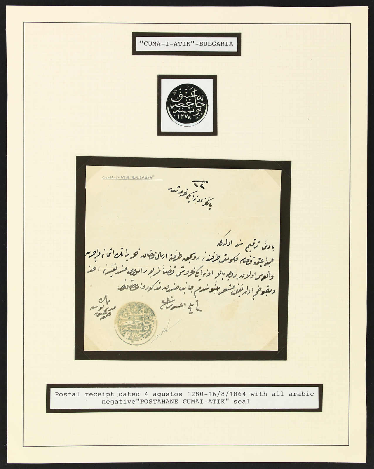 Targovishte - Eski-Cuma - Cuma-i Atik: 1864, postal receipt for 13 piastres dated 4 Agustos 1280 = 16 August 1864 showing very clear strike of Arabic negative with crescent "Postahane-i Cuma-i Atik 1278" (Post Office Targovishte 1861)