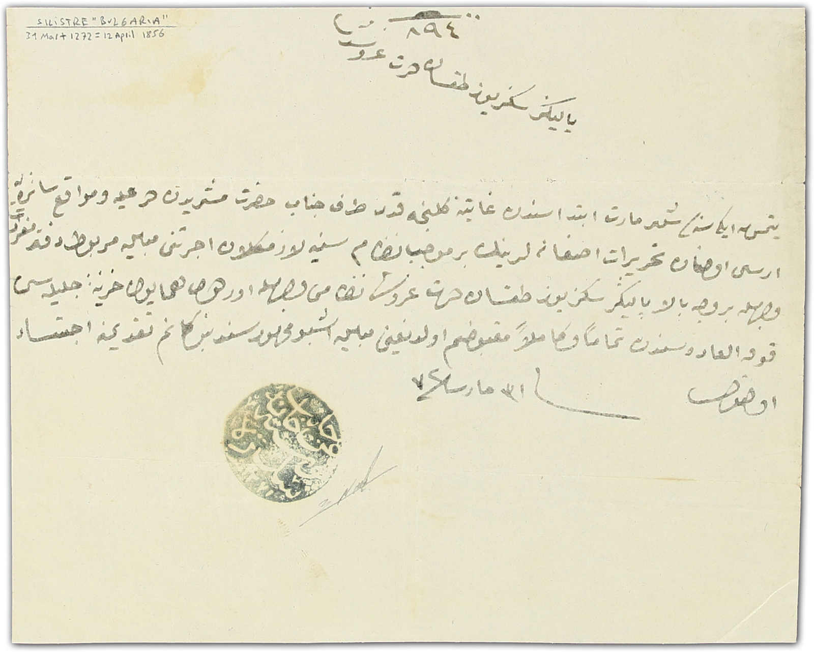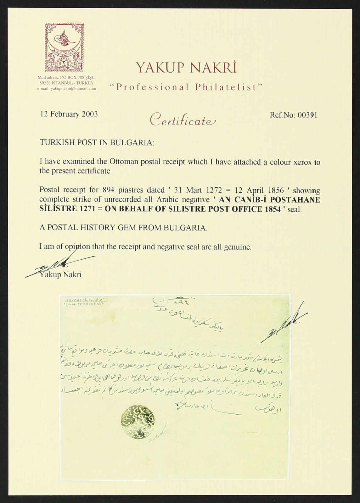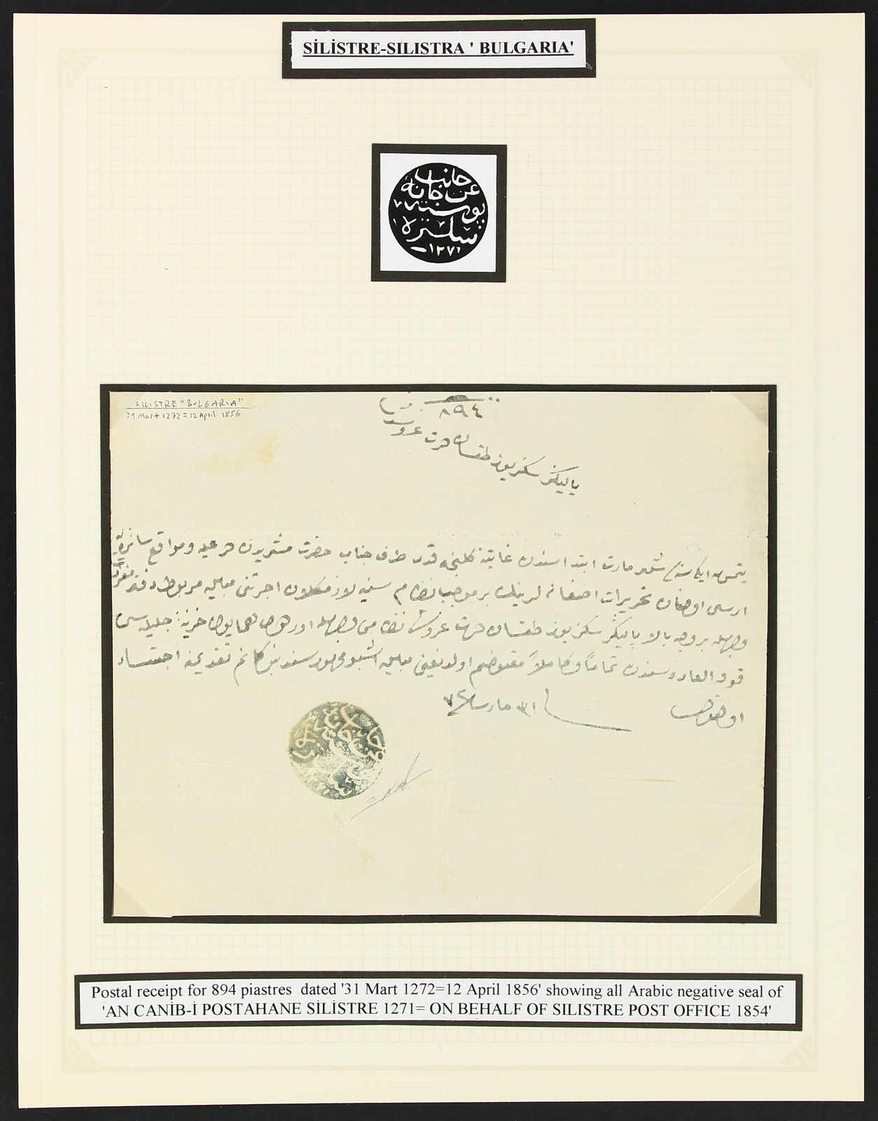 Silistra - Silistre: 1856, postal receipt for 894 piastres dated 31 Mart 1272 = 12 April 1856 showing complete strike of Arabic negative "An Canib-i Postahane Silistre 1271" (on behalf of Silistra Post Office 1854) handstamp in