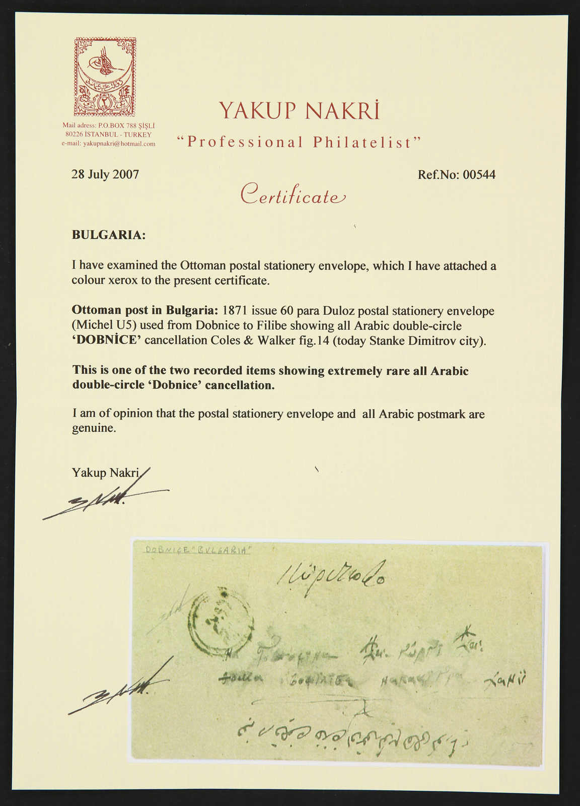 Dupnica - Dobnice: 1871, Duloz 60 pa. brown postal stationery envelope used from Dupnica to Plovdiv showing Arabic double-circle "Dobnice" handstamp (Coles & Walker fig. 14) on obverse, one of just two recorded envelopes showing this