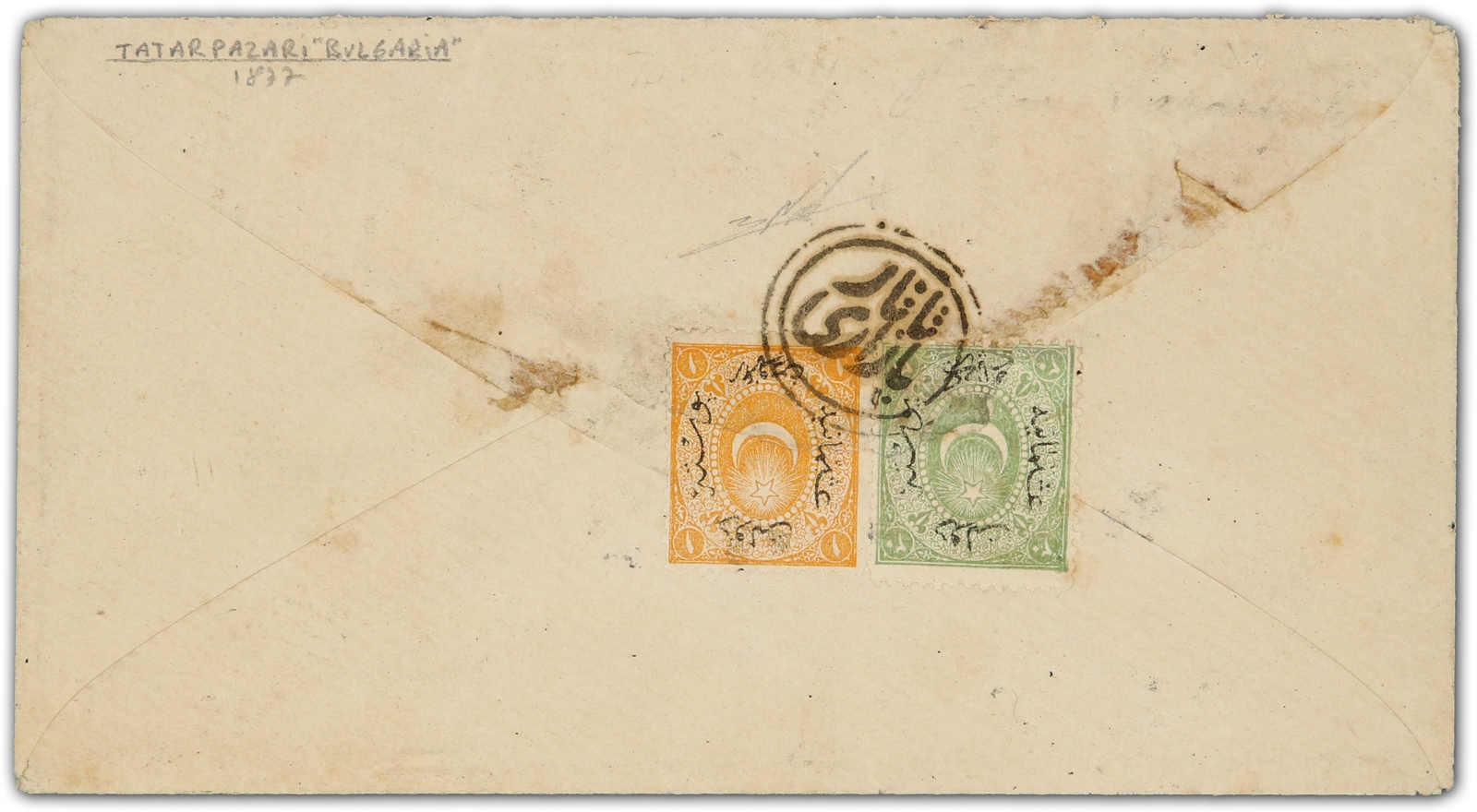 Dobrich - Tatar Pazarı - Tatar Pazarcık: 1877, cover from Dobrich to Plovdiv bearing on reverse Duloz 1875 issue 1 pi. yellow and 20 para green tied by extremely fine Arabic double-circle "Tatar Pazarı" handstamps in black (Coles & Walker