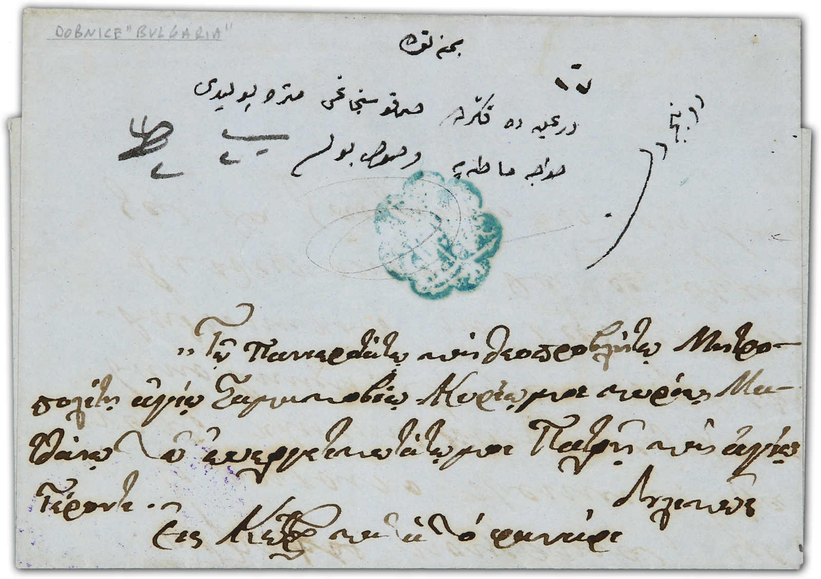 Dupnica - Dobnice: entire from Dupnica to Constantinople with Arabic negative "Ücreti Alinacaktir 273" (Fee will be collected 1856) postage due handstamp in blue (Coles & Walker fig.15), Arabic manuscript "Dobnice'den" (from Dupnica) and